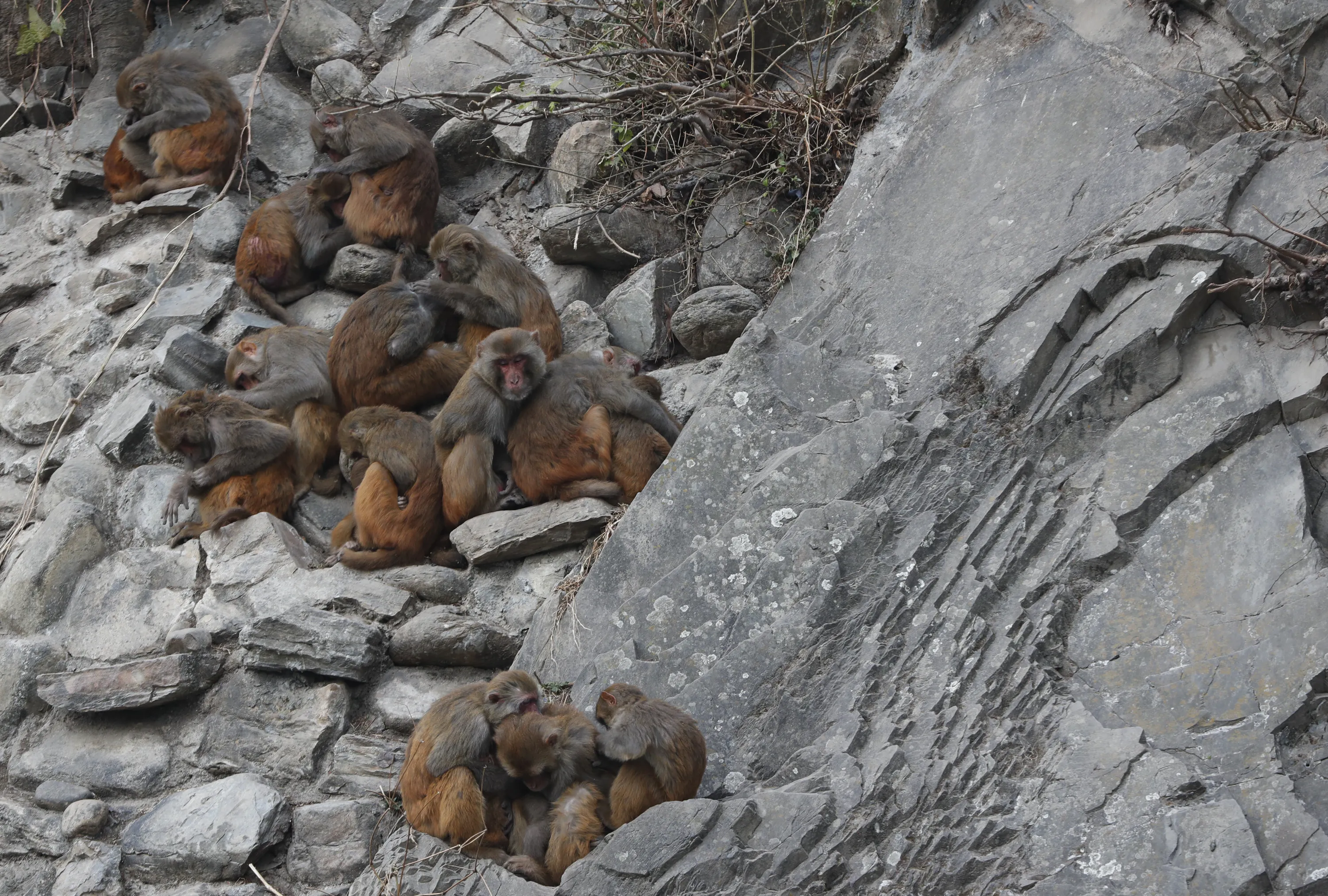 Monkeys huddle to keep themselves warm at Swayambhunath Stupa in Kathmandu, Nepal, Wednesday, January 8, 2020. Swayambhunath Stupa is also known as the monkey temple, due to the large number of monkeys inhabiting the area. (Photo by Niranjan Shrestha/AP Photo)