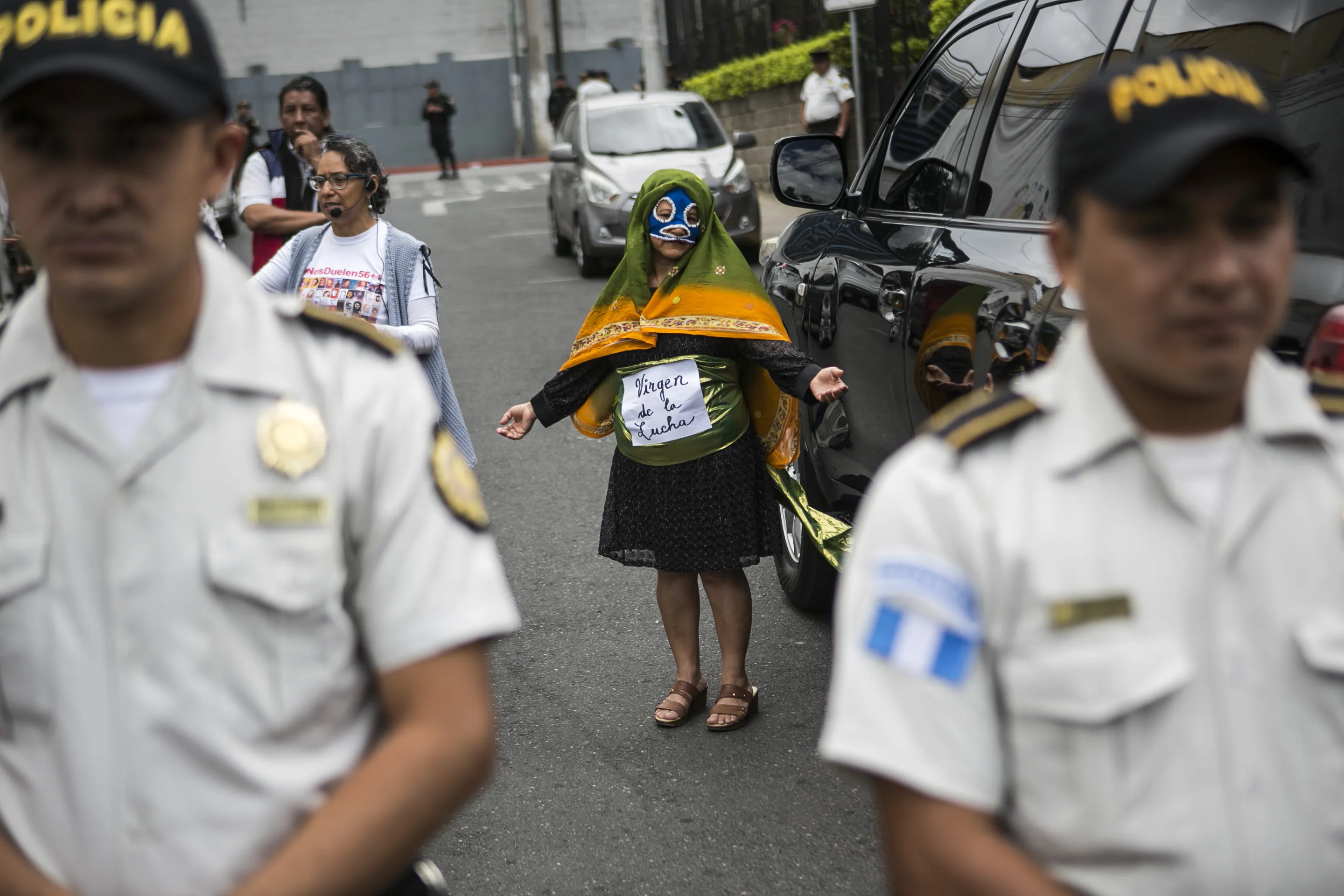 A demonstrator wearing a costume that reads in Spanish: “Virgin of the fight” protests outgoing President Jimmy Morales outside the Central American Parliament building where Morales will arrive to join the parliament as a lawmaker, in Guatemala City, Tuesday, January 14, 2020. Guatemala will inaugurate on Tuesday a new president as Morales exits amid swirling corruption accusations. (Photo by Oliver de Ros/AP Photo)