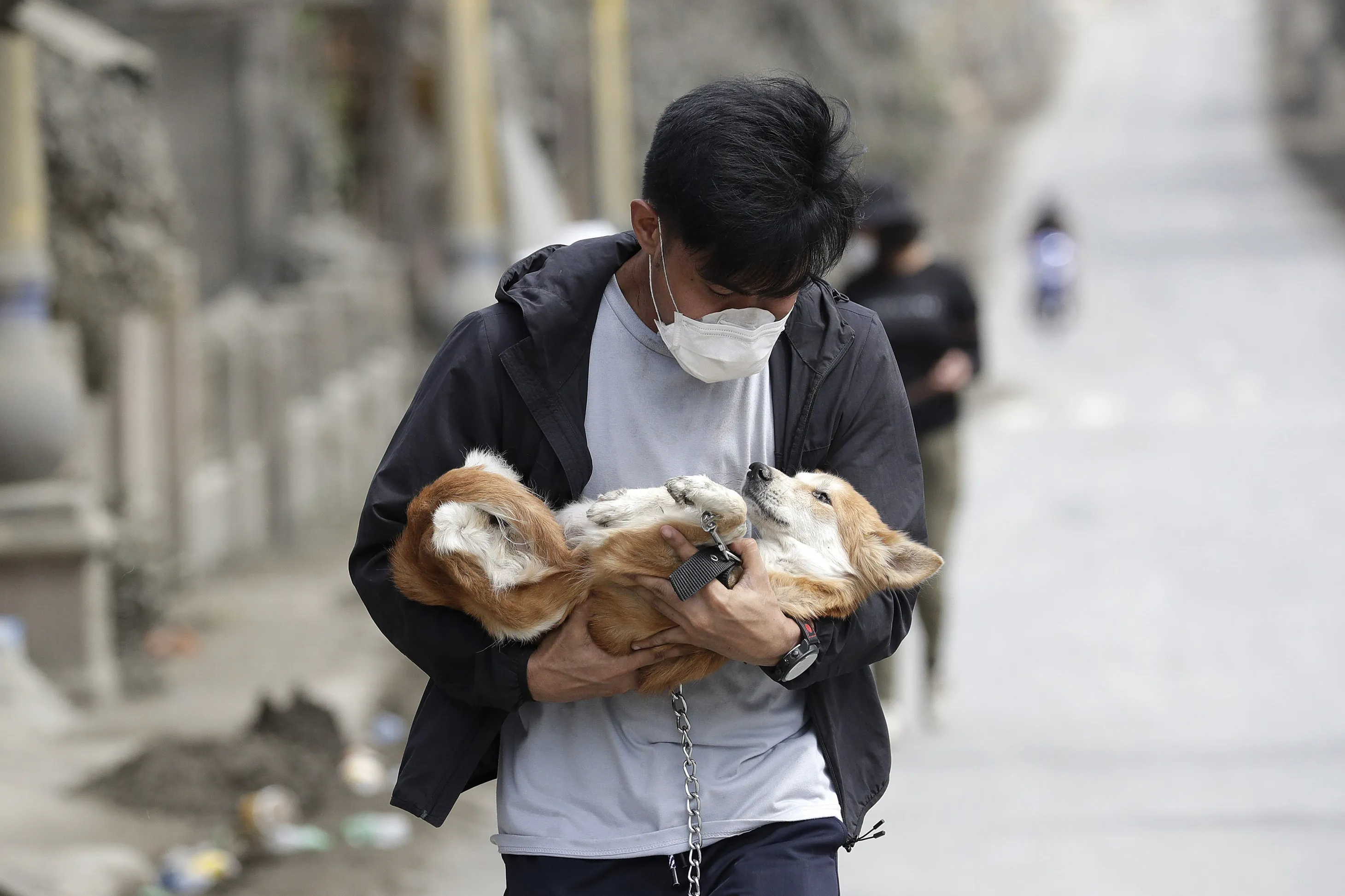 An animal volunteer carries a dog he rescued from deserted homes near Taal volcano as residents evacuated to safer grounds leaving some of their pets behind in Talisay, Batangas province, southern Philippines on Wednesday January15, 2020. Taal volcano is spewing lava into the sky and trembled constantly, possibly portending a bigger and more dangerous eruption, as tens of thousands of people fled villages darkened and blanketed by heavy ash. (Photo by Aaron Favila/AP Photo)