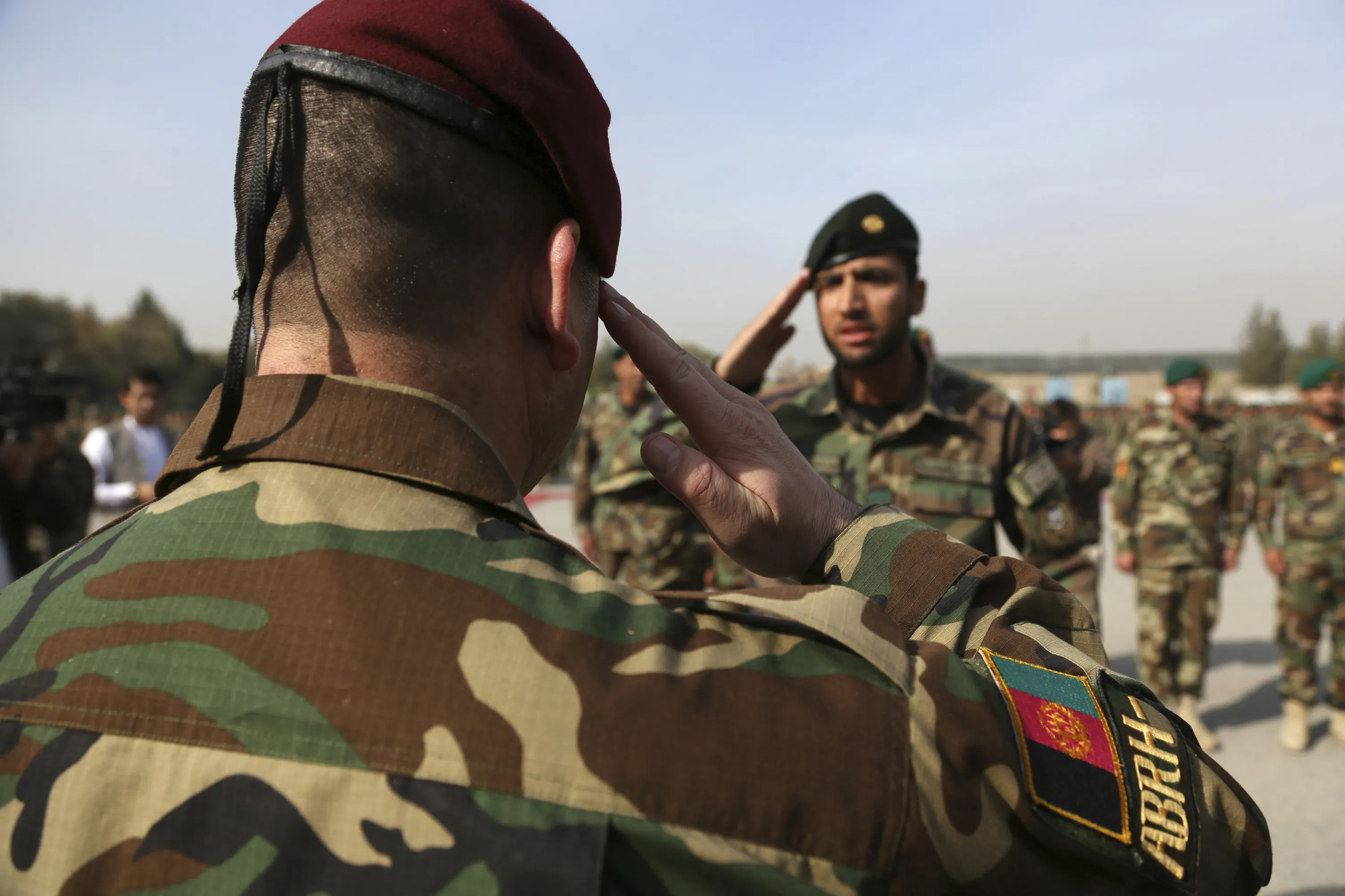 An Afghan National Army soldier, center, salutes to his commander during a graduation ceremony from a three-month training program at the Afghan Military Academy in Kabul, Afghanistan, Monday, October 28, 2019. (Photo by Rahmat Gul/AP Photo)