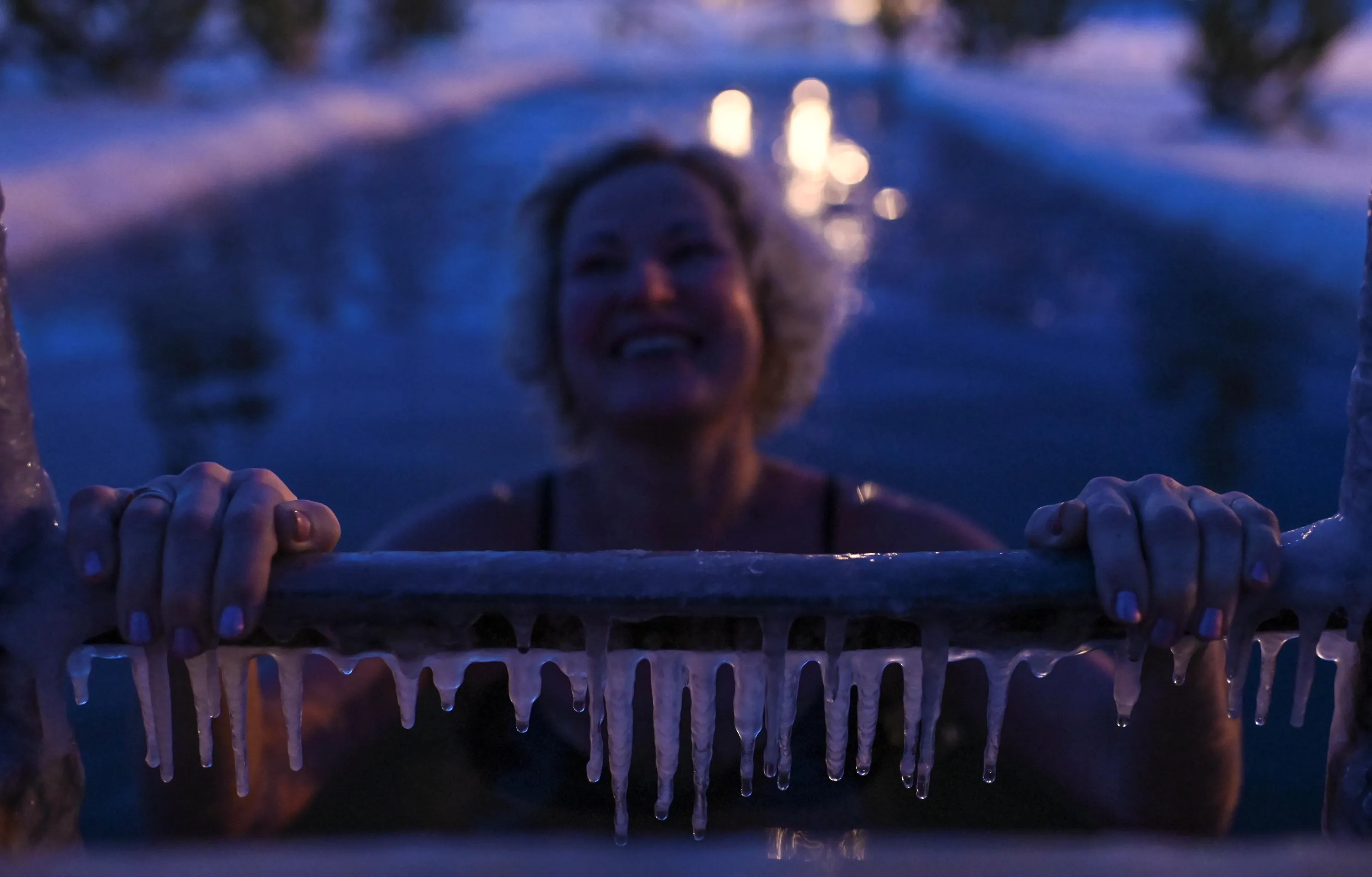 A woman reacts while taking a dip in the freezing waters of the Irtysh River during celebrations of the Orthodox Christian feast of Epiphany in Omsk, Russia on January 18, 2020. (Photo by Alexey Malgavko/Reuters)