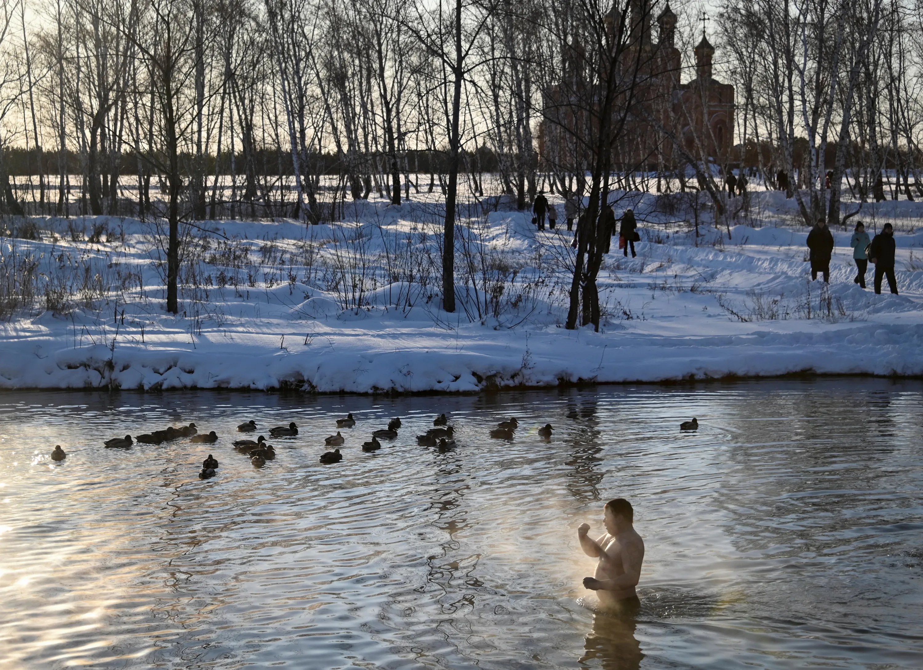 A man crosses himself as he takes a dip during celebrations of the Orthodox Christian feast of Epiphany in Omsk, Russia on January 19, 2020. (Photo by Alexey Malgavko/Reuters)