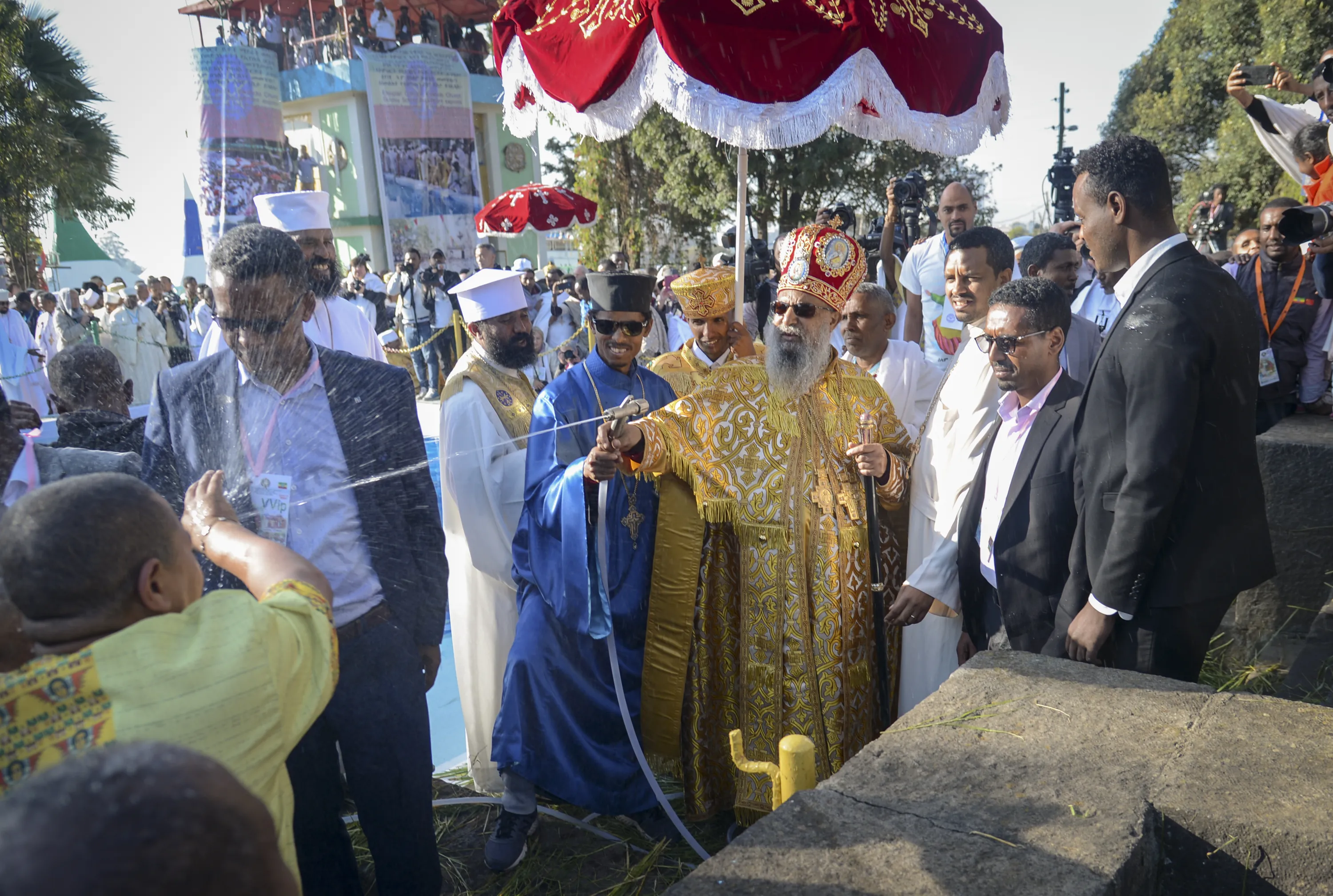Patriarch of the Ethiopian Orthodox Church, Abune Mathias, sprays holy water on Christians as they celebrate the annual festival of Timkat, or Epiphany, marking the baptism of Jesus Christ in the River Jordan, in the capital Addis Ababa, Ethiopia Monday, January 20, 2020. During Timkat celebrations elsewhere in the country, in the city of Gondar, at least three people are dead after a wooden stand erected for the event collapsed on Monday, according to a hospital source. (Photo by AP Photo/Stringer)