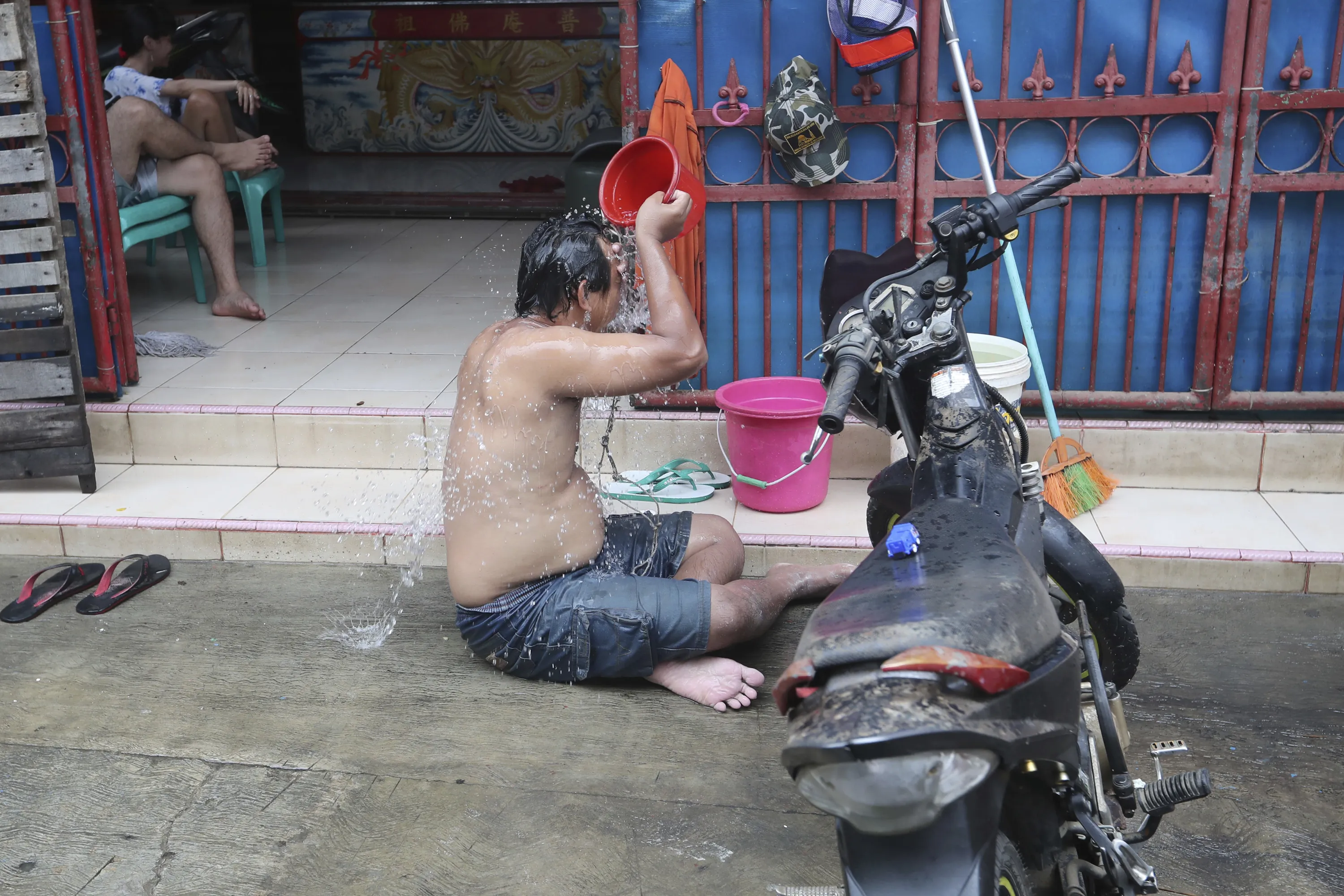 A man takes a shower in front of his flood-damaged house in Jakarta, Indonesia, Sunday, January 5, 2020. (Photo by Tatan Syuflana/AP Photo)