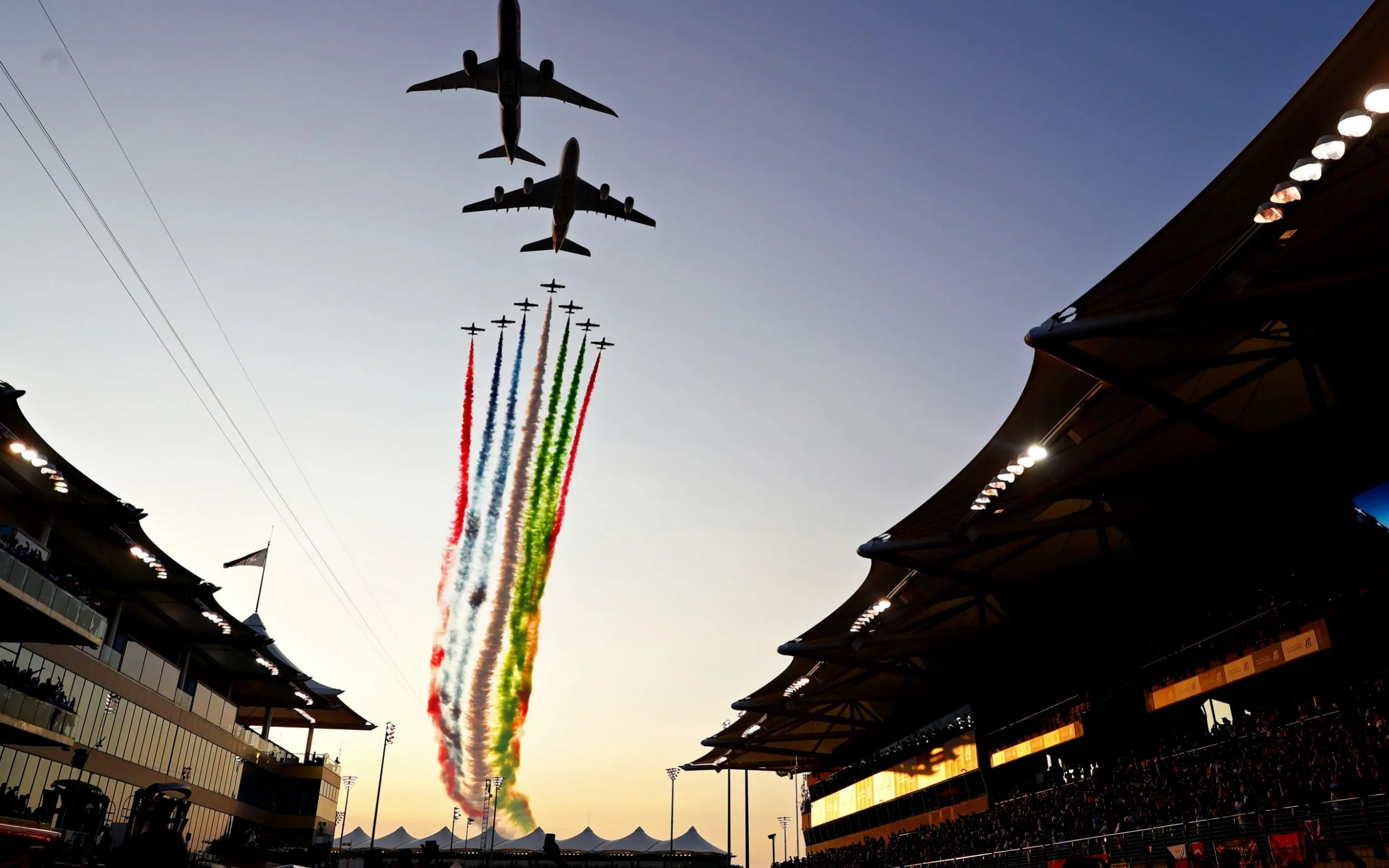 An aeronautical display is seen over the grid before the F1 Grand Prix of Abu Dhabi at Yas Marina Circuit on December 01, 2019 in Abu Dhabi, United Arab Emirates. (Photo by Mark Thompson/Getty Images)