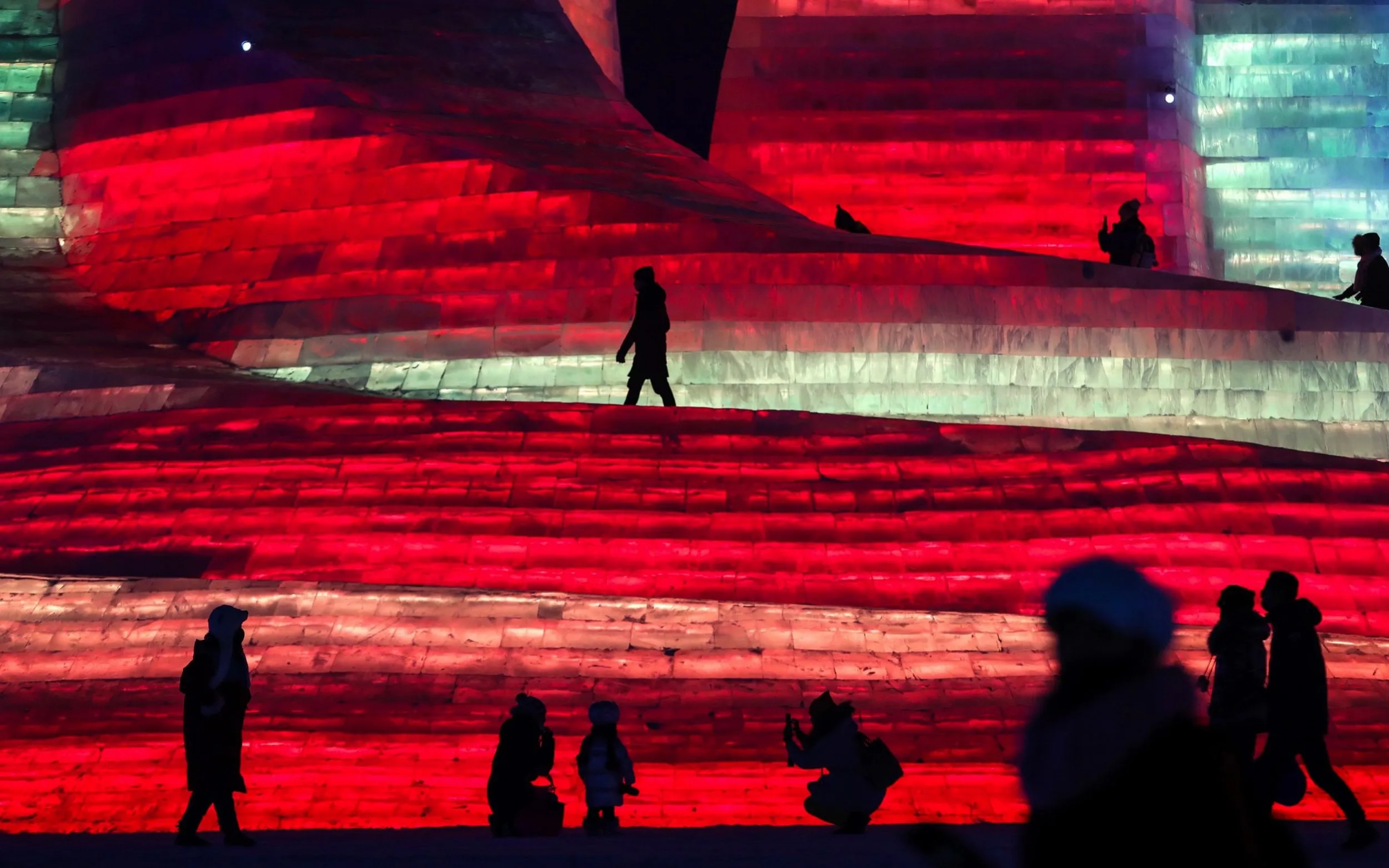 Visitors look at an ice sculpture on the opening night of the Harbin International Ice and Snow Festival in Harbin in northeastern China's Heilongjiang Province, Sunday, January 5, 2020. The Harbin International Ice and Snow Festival is known for massive, elaborate, and colorfully lit ice sculptures featuring animals, cartoon characters, and various landmarks. (Photo by Chinatopix via AP Photo)