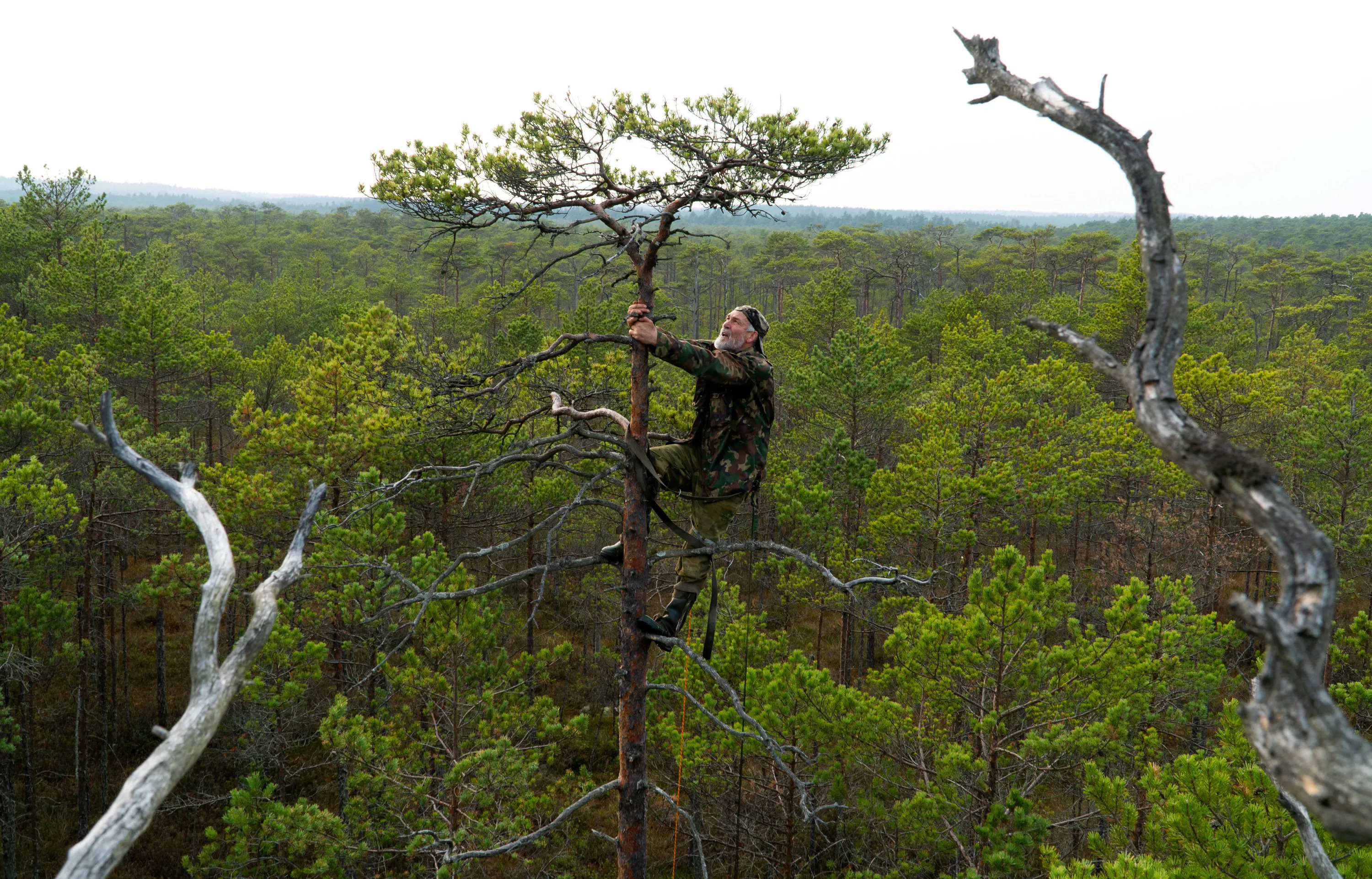 Belarusian ornithologist Vladimir Ivanovski, 72, stands on a tree as he builds an artificial nest for birds of prey from tree branches, in a marsh near the village of Kazyany, Belarus on October 20, 2019. (Photo by Vasily Fedosenko/Reuters)