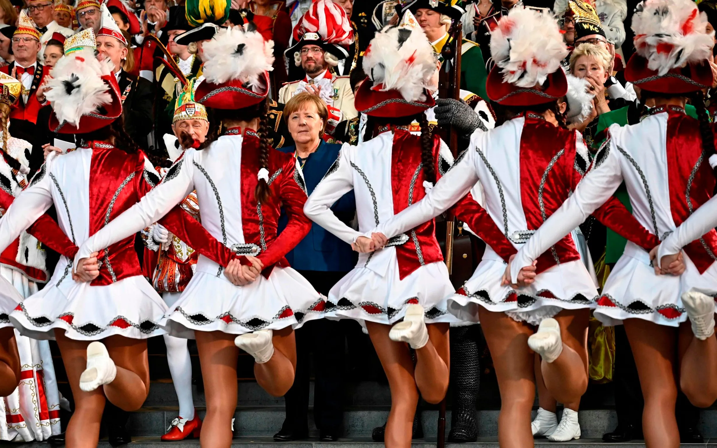 German Chancellor Angela Merkel (C) watches a performance of a carnival dance group as she poses with members of carnival orders during a reception on January 22, 2020 at the Chancellery in Berlin. (Photo by Tobias Schwarz/AFP Photo)