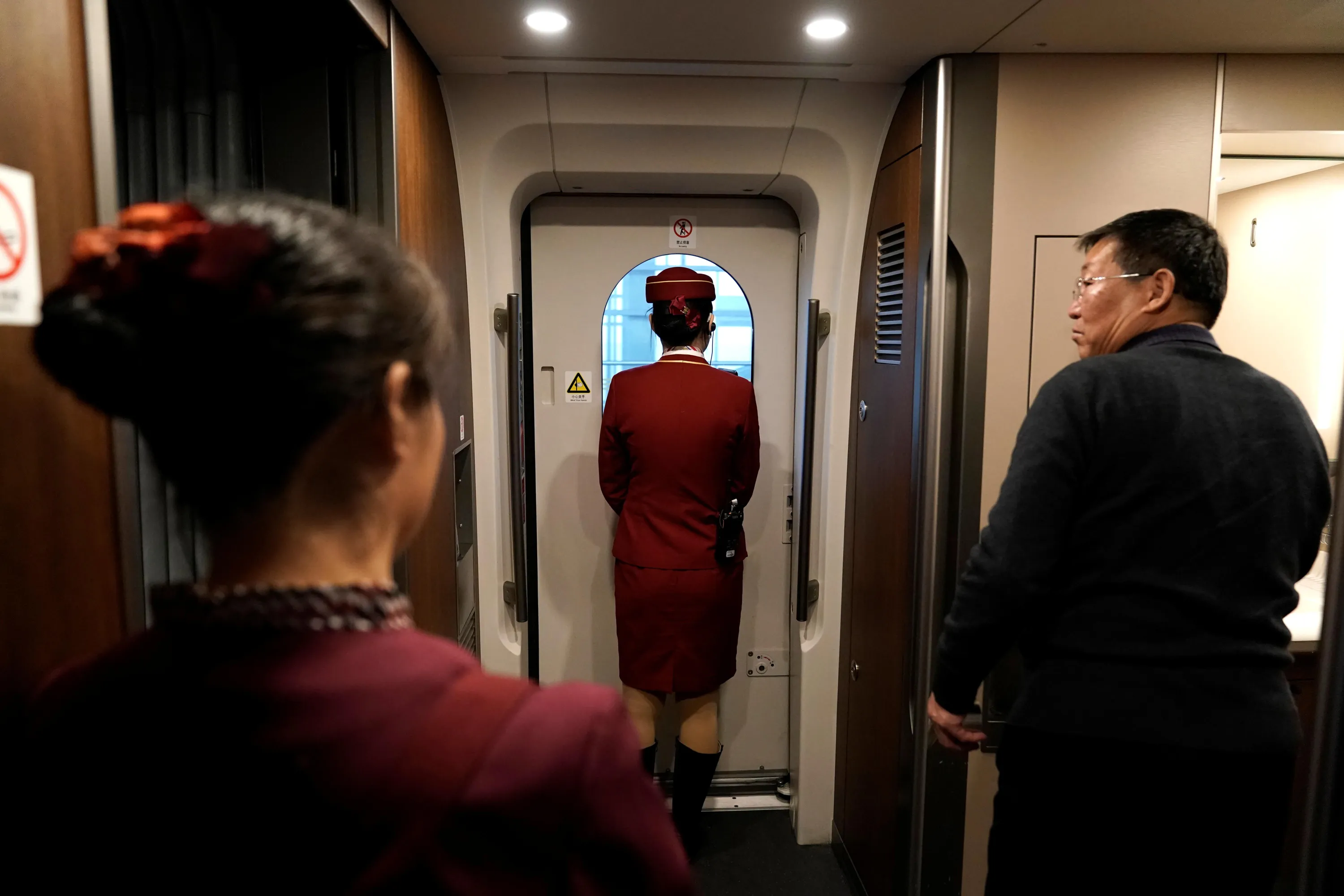 An employee stands behind a door as the train arrives at a railway station while the annual Spring Festival travel rush begins ahead of the Chinese Lunar New Year, in Baoding, Hebei province, China on January 10, 2020. (Photo by Jason Lee/Reuters)