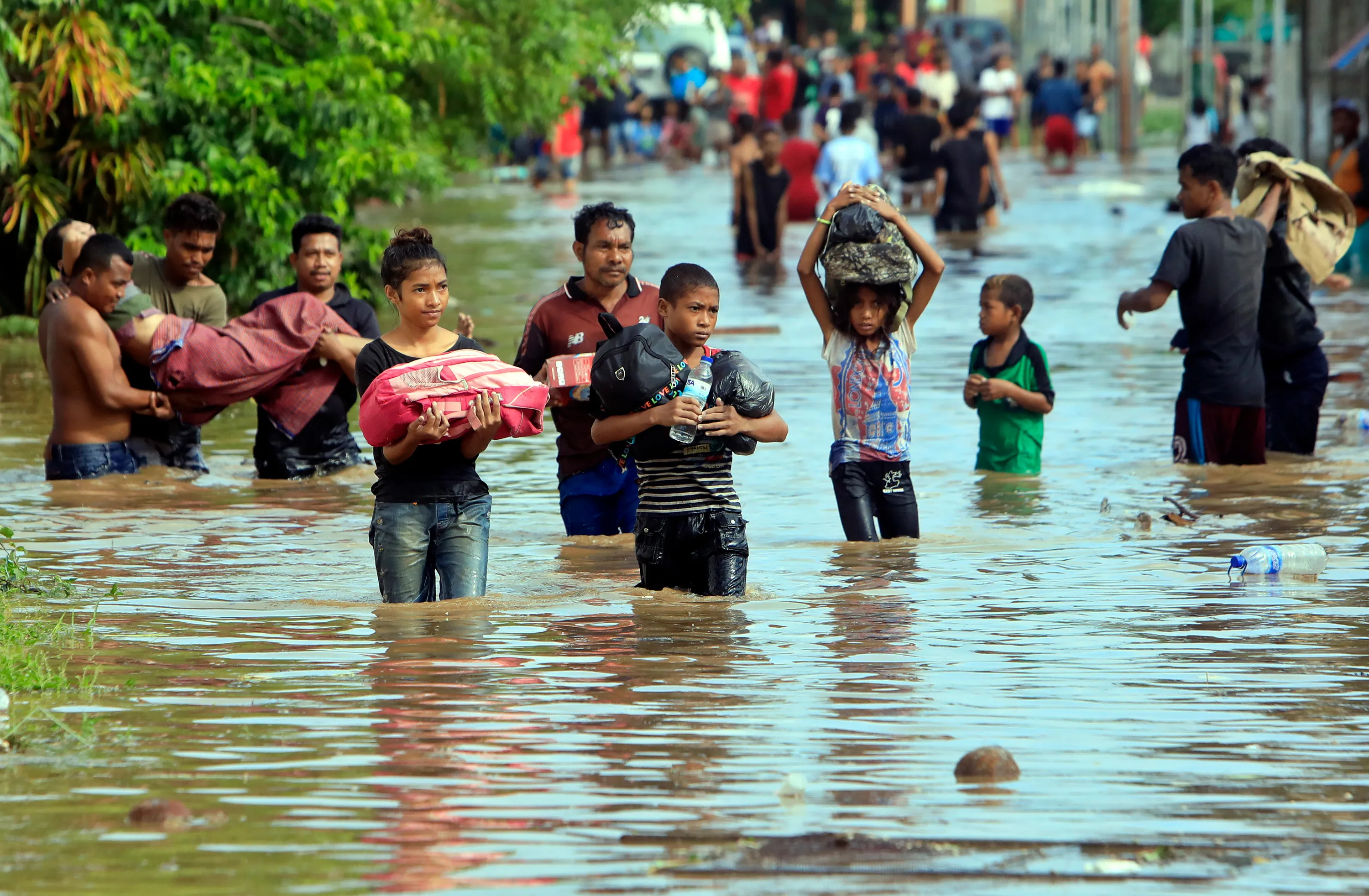 East Timorese people navigate a flooded street after heavy rains, in Tasitolu, Dili, East Timor, also known as Timor Leste, 23 January 2020. Heavy rains triggered flooding in some parts of Dili. (Photo by Antonio Dasiparu/EPA/EFE)