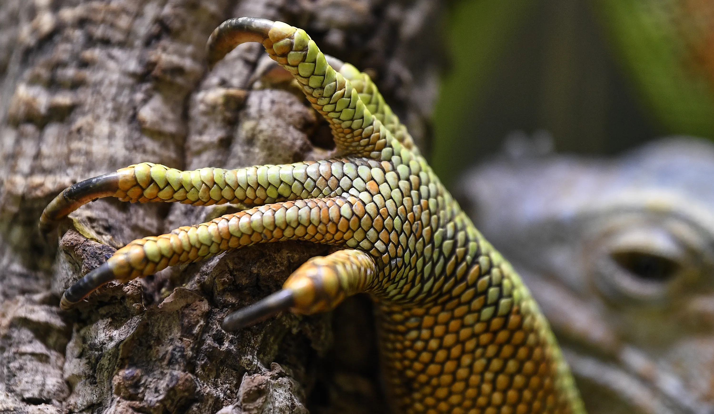 An iguana shows his claw at the reptiles sanctuary and zoo in Rheinberg, Germany, Wednesday, January 15, 2020. The sanctuary takes care of dangerous animals from overwhelmed owners or illegally imported reptiles found at airports. (Photo by Martin Meissner/AP Photo)