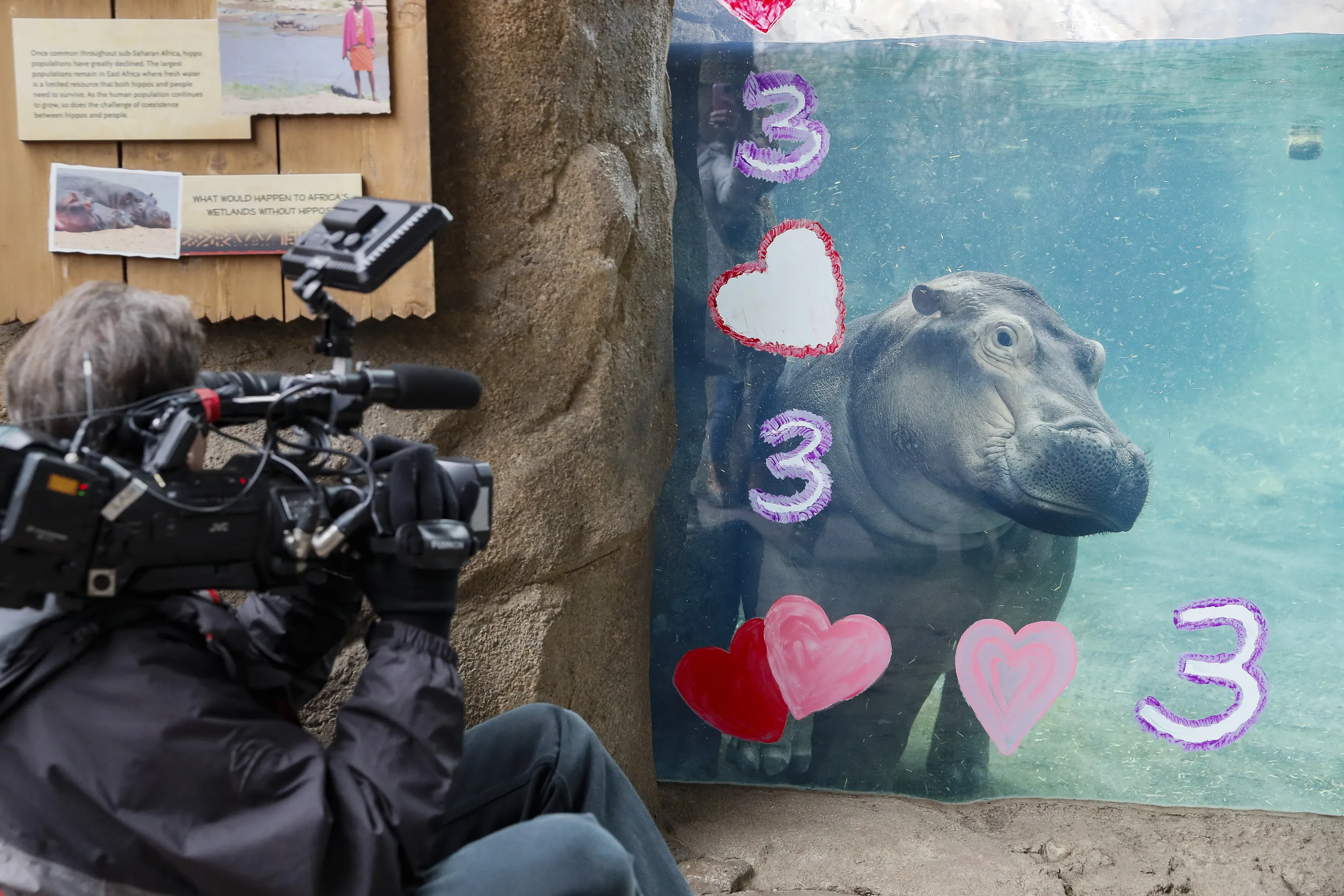 Fiona, a Nile Hippopotamus, plays near a journalist after eating her specialty birthday cake to celebrate turning three-years old this Friday, in her enclosure at the Cincinnati Zoo & Botanical Garden, Thursday, January 23, 2020, in Cincinnati. (Photo by John Minchillo/AP Photo)