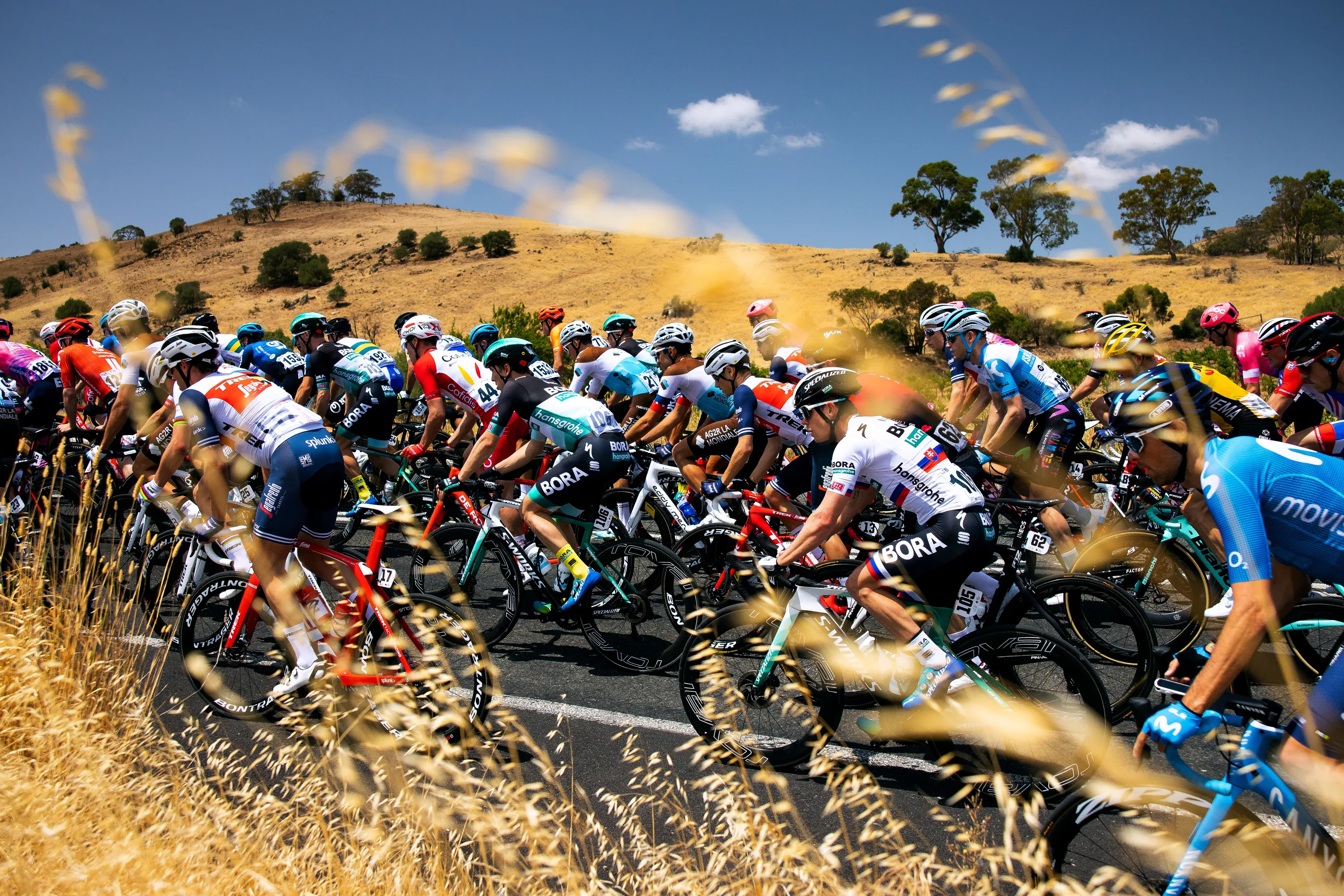 The peloton rides through the South Australian landscape during the first stage of the Santos Tour Down in Tanunda, Australia on January 21, 2020. (Photo by Daniel Kalisz/Getty Images)