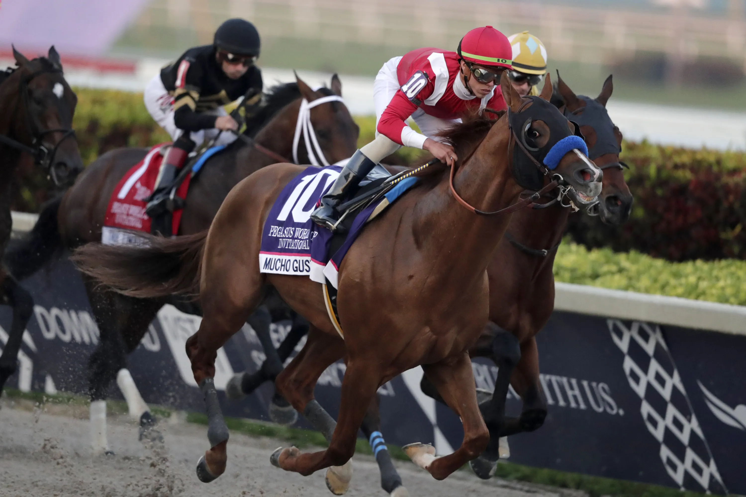Jockey Irad Ortiz, Jr., atop Mucho Gusto (10), competes during the Pegasus World Cup Invitational horse race, Saturday, January 25, 2020, at Gulfstream Park in Hallandale Beach, Fla. Mucho Gusto won the race. (Photo by Lynne Sladky/AP Photo)