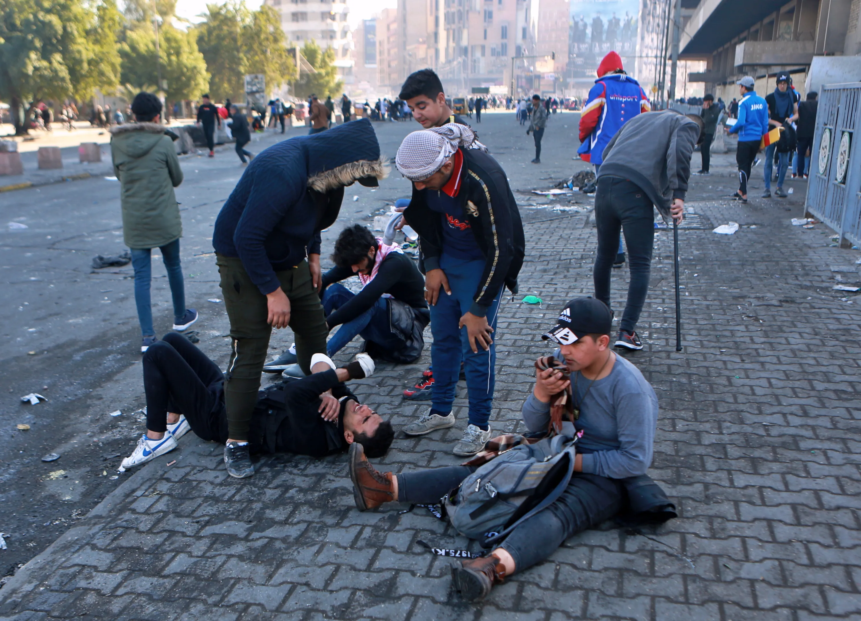 Anti-government protesters react to tear gas fired by security forces during clashes in Baghdad, Iraq, Monday, January 27, 2020. (Photo by Khalid Mohammed/AP Photo)