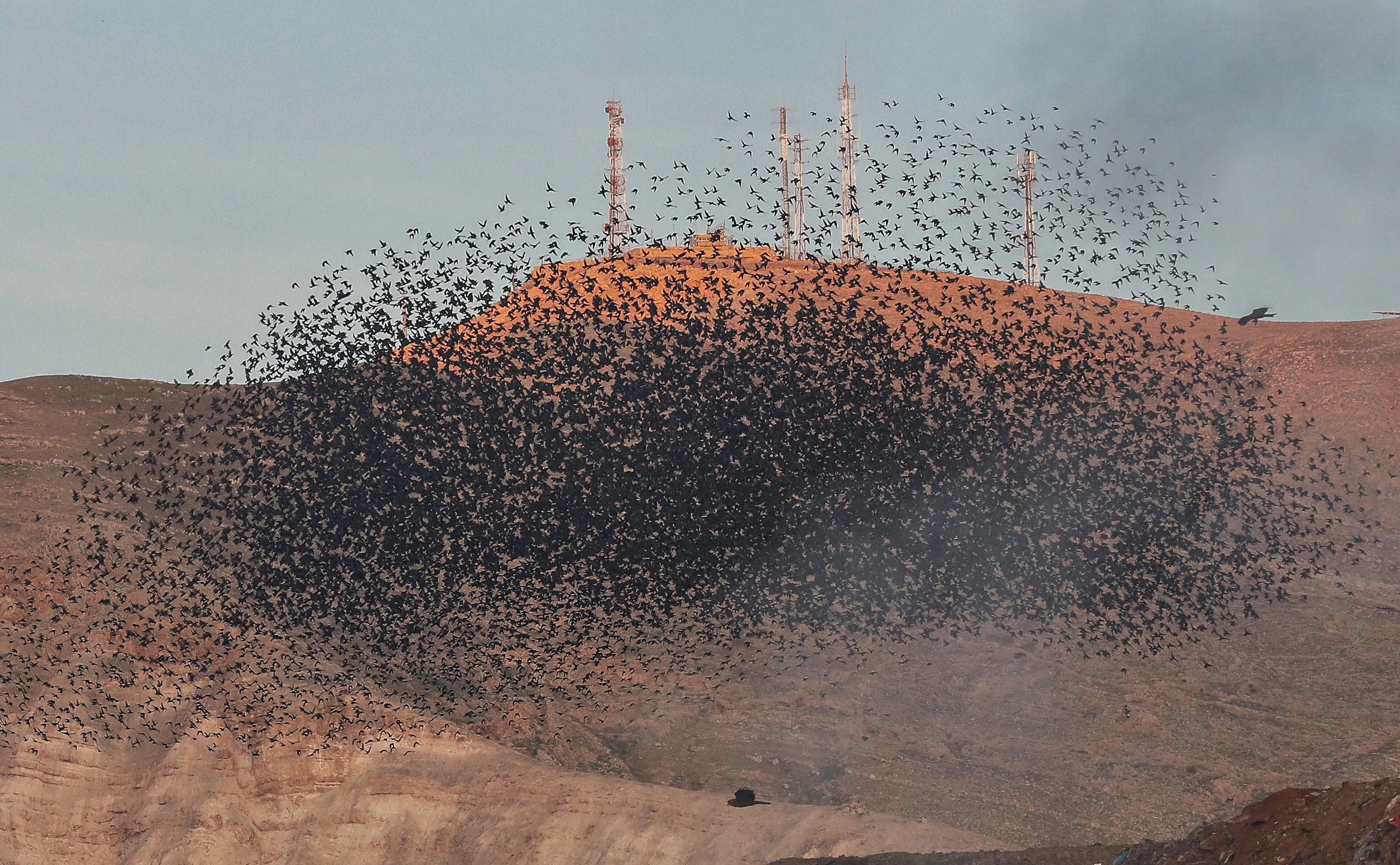This picture taken on January 27, 2020 shows a murmuration of starlings near the Israeli settlement of Masua in the Jordan Valley in the occupied West Bank. (Photo by Emmanuel Dunand/AFP Photo)