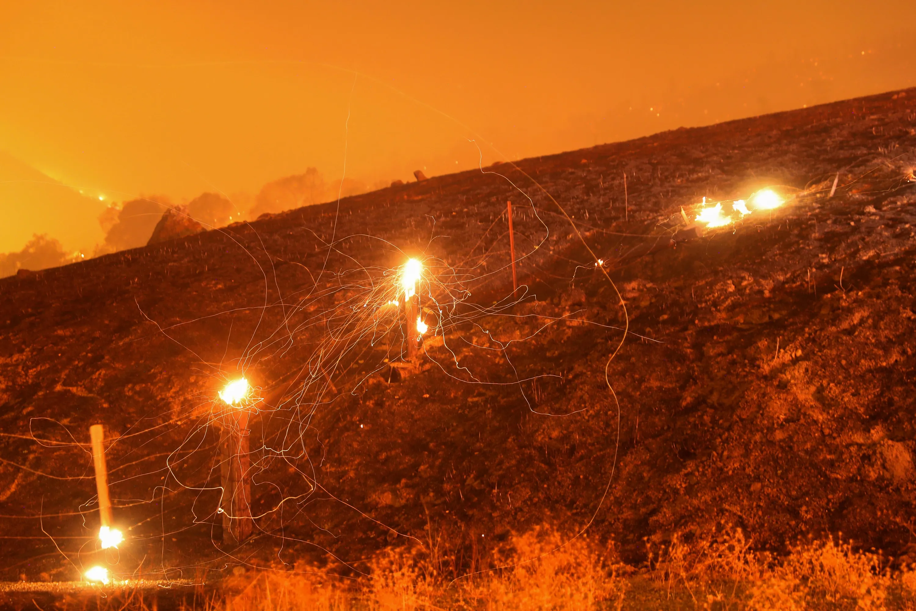 Flying embers from a destroyed fence are seen during the Kincade fire near Geyserville, California, U.S. October 24, 2019. (Photo by Stephen Lam/Reuters)