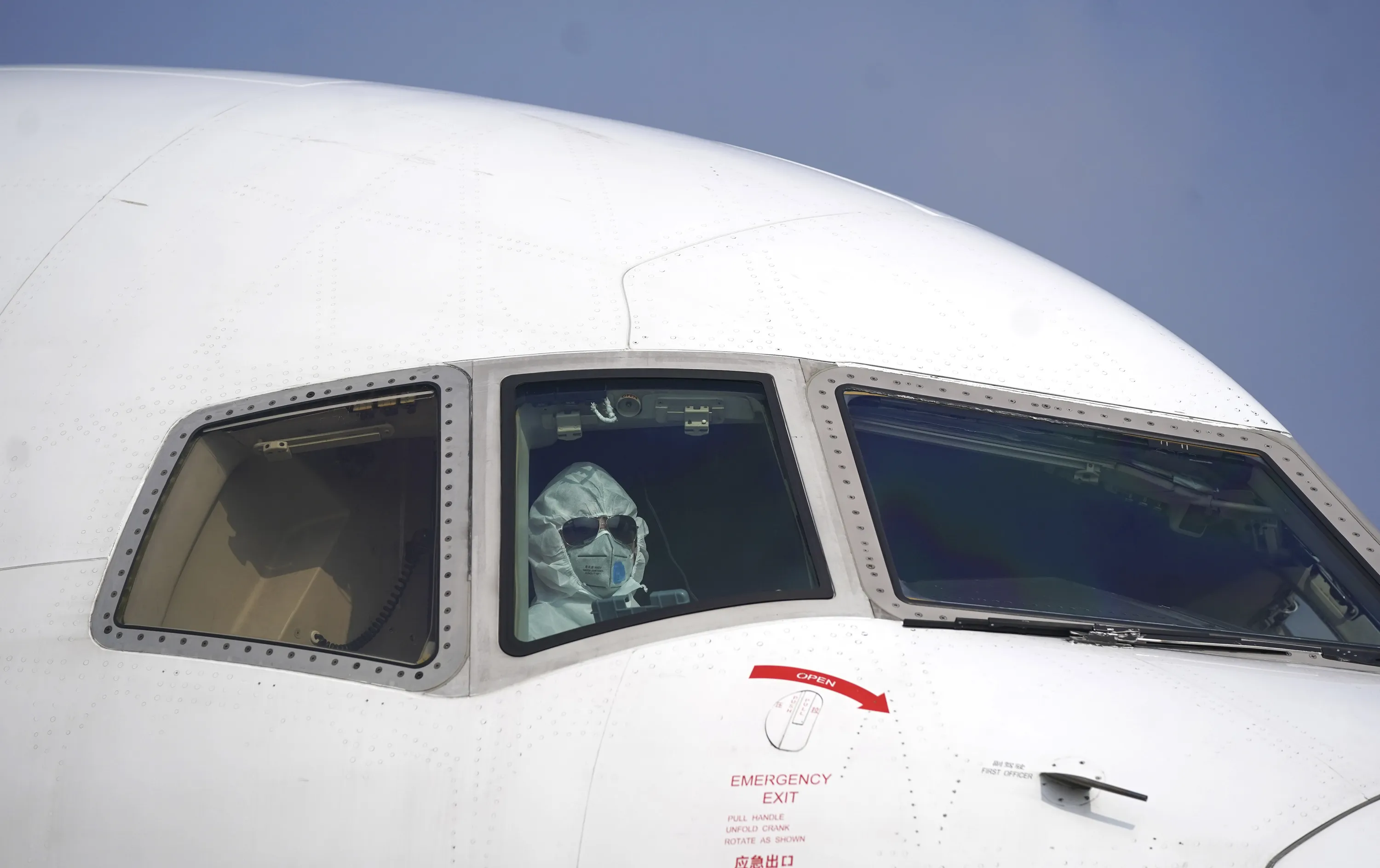 In this photo released by China's Xinhua News Agency, a pilot wearing a protective suit parks a cargo plane at Wuhan Tianhe International Airport in Wuhan in central China's Hubei Province, Tuesday, January 28, 2020. Hong Kong's leader announced Tuesday that all rail links to mainland China will be cut starting Friday as fears grow about the spread of a new virus. (Photo by Cheng Min/Xinhua via AP Photo)
