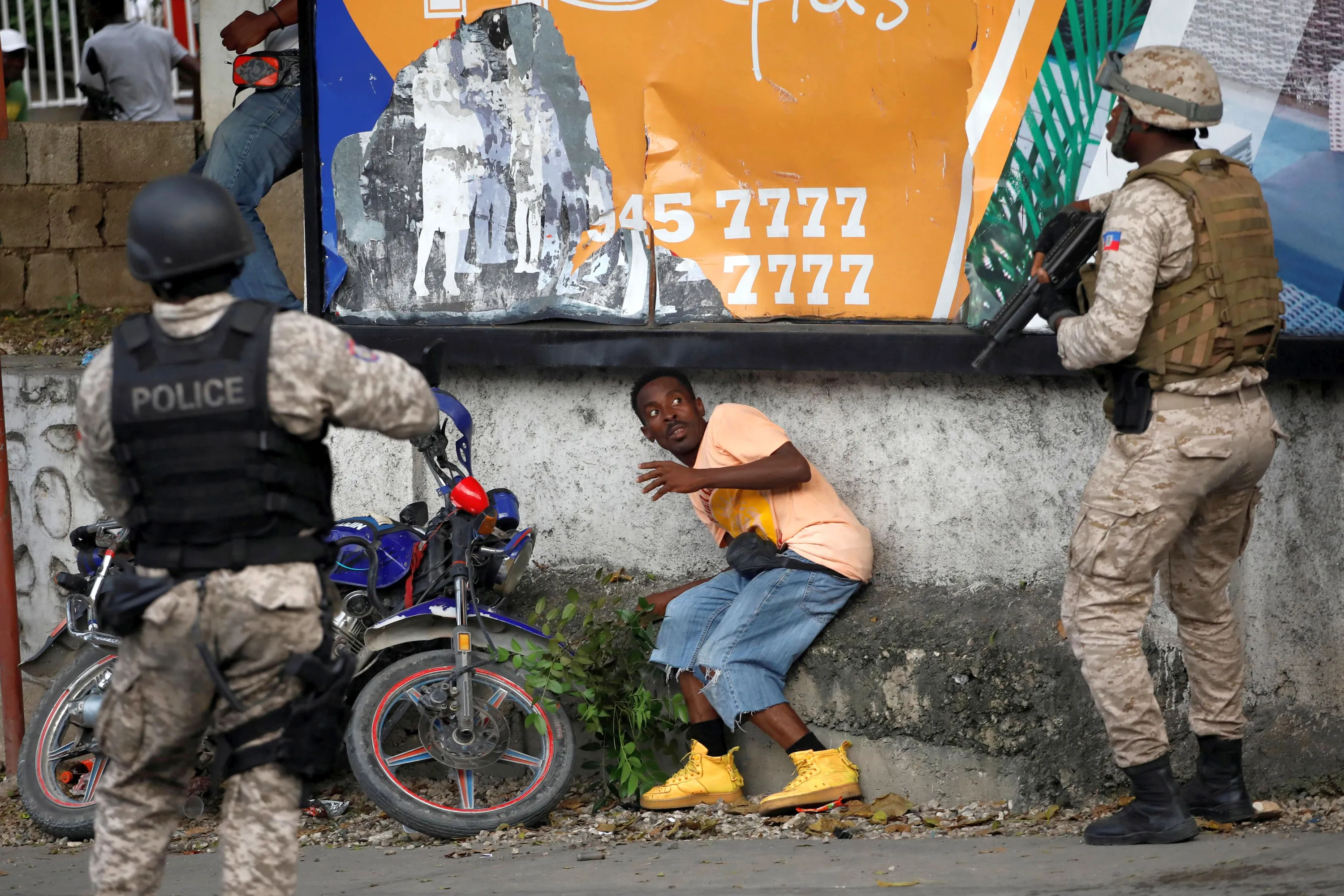A man reacts in front of Haitian National Police (PNH) officers during clashes with protesters marching to demand the resignation of Haitian President Jovenel Moise, in the streets of Petion Ville, Port-au-Prince, Haiti on October 20, 2019. (Photo by Andres Martinez Casares/Reuters)