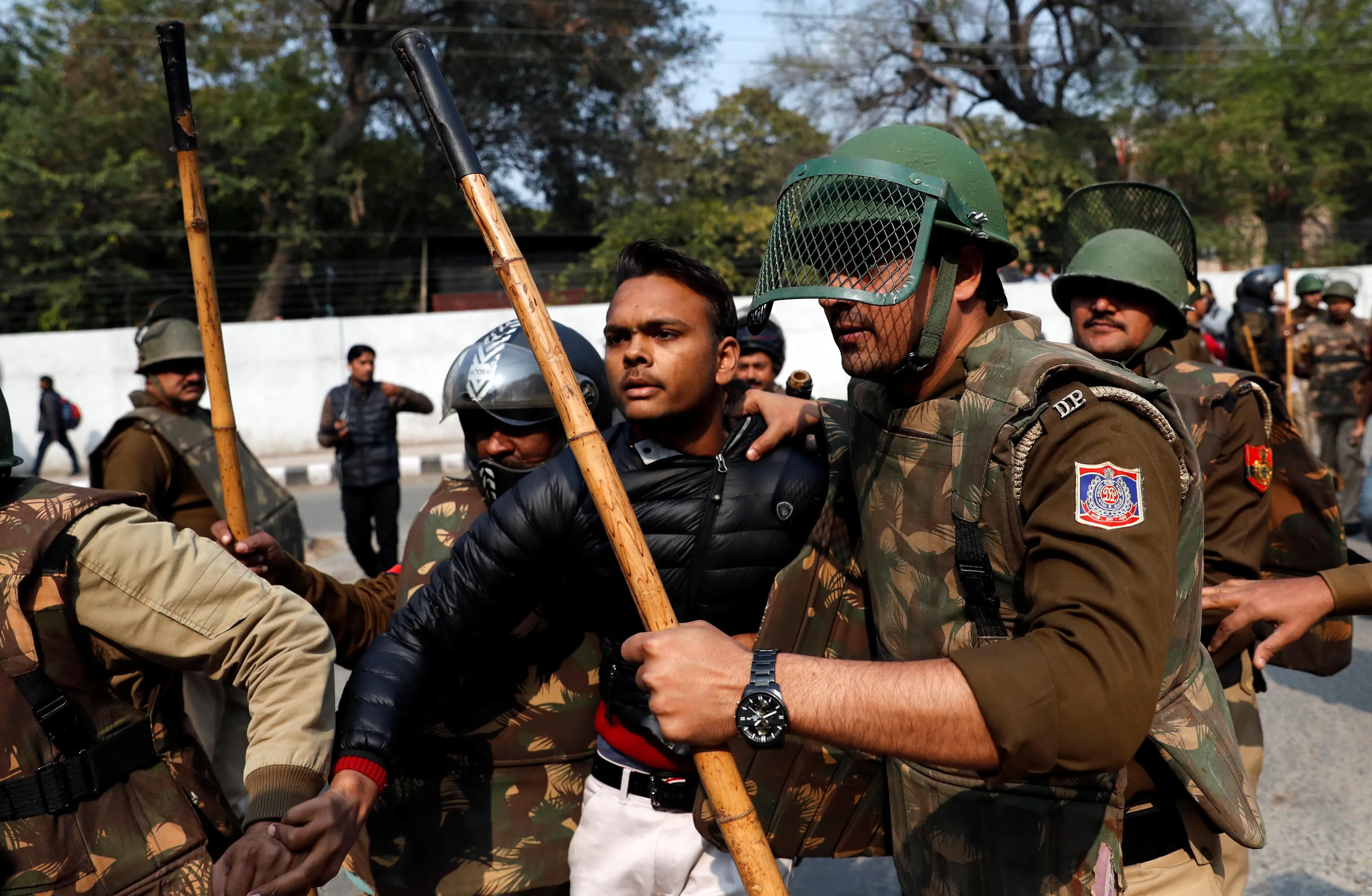 Police detain an unidentified man after he brandished a gun and injured a student during a protest against a new citizenship law outside the Jamia Millia Islamia university in New Delhi, India, January 30, 2020. Minutes before firing, the shooter, who identified himself as “Rambhakt Gopal” had uploaded posts onto his Facebook profile saying this will be his “final journey” and urging readers to “remember his family”. His video showed him walking through a road near Jamia, where the students were gathering. On his Facebook the shooter had also posted photos of himself posing with a gun and he is seen wearing a saffron T-shirt, the color of Hindu nationalists. (Photo by Danish Siddiqui/Reuters)