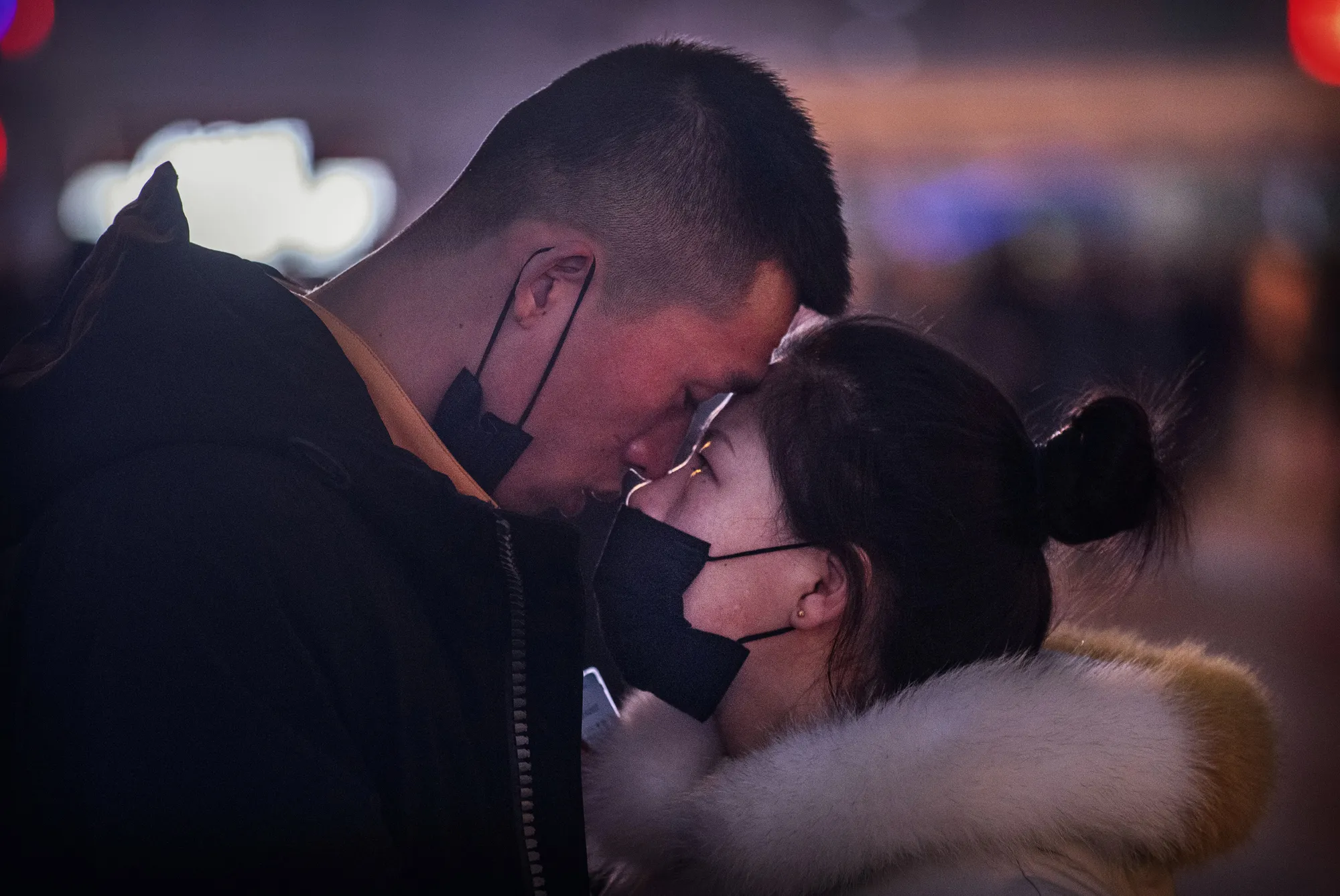 A Chinese man with his protective mask briefly pulled back shares a moment with his partner as she wears her protective mask before saying goodbye at Beijing Station before the annual Spring Festival on January 22, 2020 in Beijing, China. The number of cases of a deadly new coronavirus rose to over 400 in mainland China Wednesday as health officials stepped up efforts to contain the spread of the pneumonia-like disease which medicals experts confirmed can be passed from human to human. The number of those who have died from the virus in China climbed to nine on Wednesday and cases have been reported in other countries including the United States,Thailand, Japan, Taiwan and South Korea. (Photo by Kevin Frayer/Getty Images)