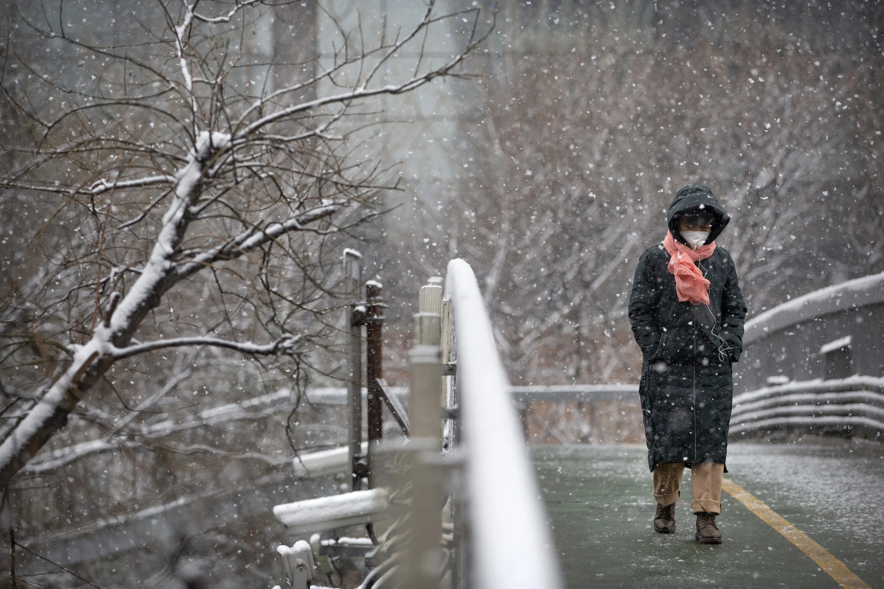 A woman wears a face mask as she walks across a pedestrian bridge during a snowfall in Beijing, Sunday, February 2, 2020. China's death toll from a new virus increased to 304 on Sunday amid warnings from the World Health Organization that other countries need to prepare in the event the disease spreads among their populations as more nations report local infections. (Photo by Mark Schiefelbein/AP Photo)