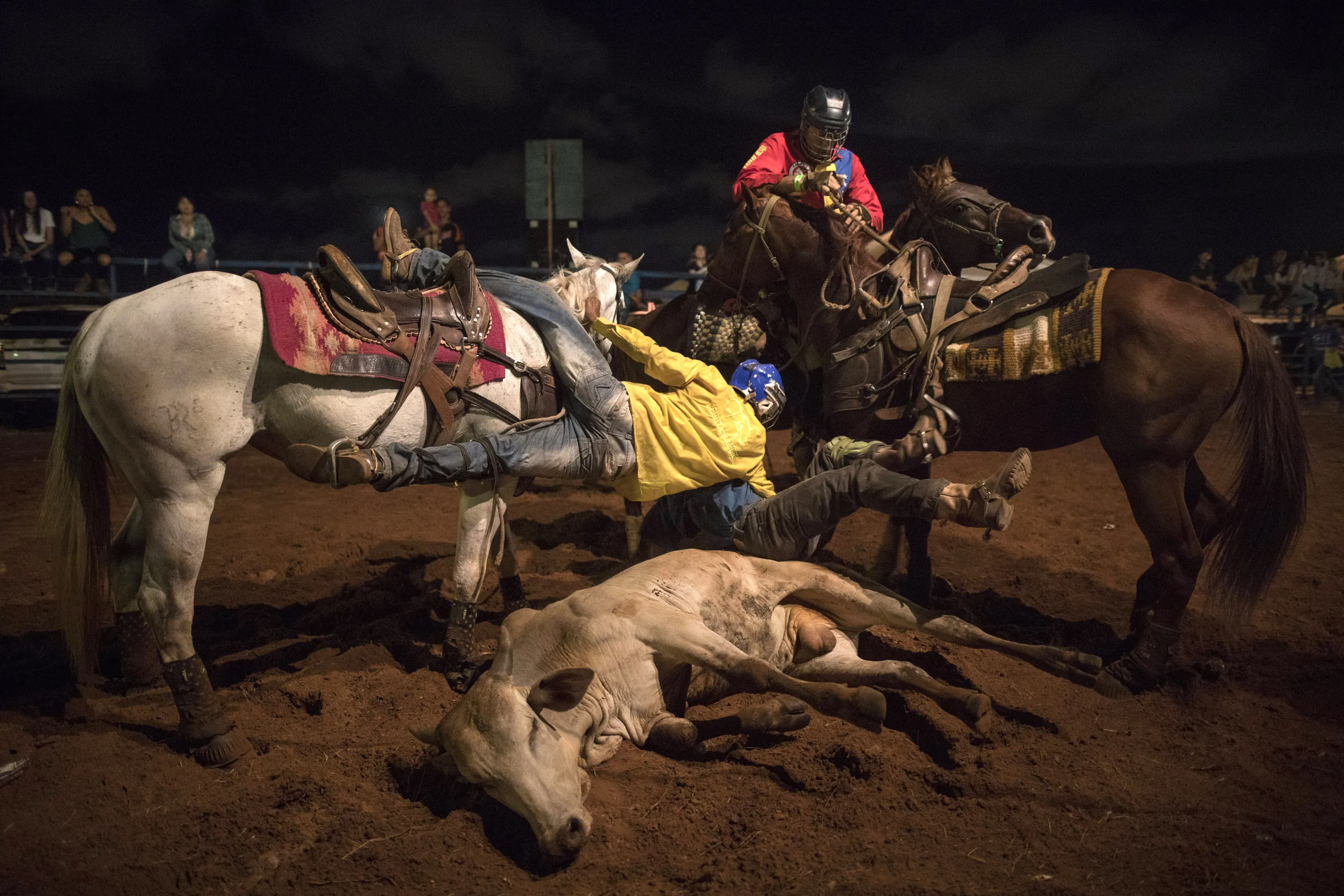 In this November 18, 2019 photo, cowboys compete to grab a bull's tail during a rodeo in Maracaibo, Venezuela. The sport is from Venezuela's cattle regions and is called “Coleo”, loosely meaning grabbing the tail. The downfall of Maracaibo has been especially brutal. Critics blame two decades of socialist rule for destroying the oil industry, that today produces a fraction of what it did at its height two decades ago. The Venezuelan government blames U.S. sanctions for many of its problems. (Photo by Rodrigo Abd/AP Photo)