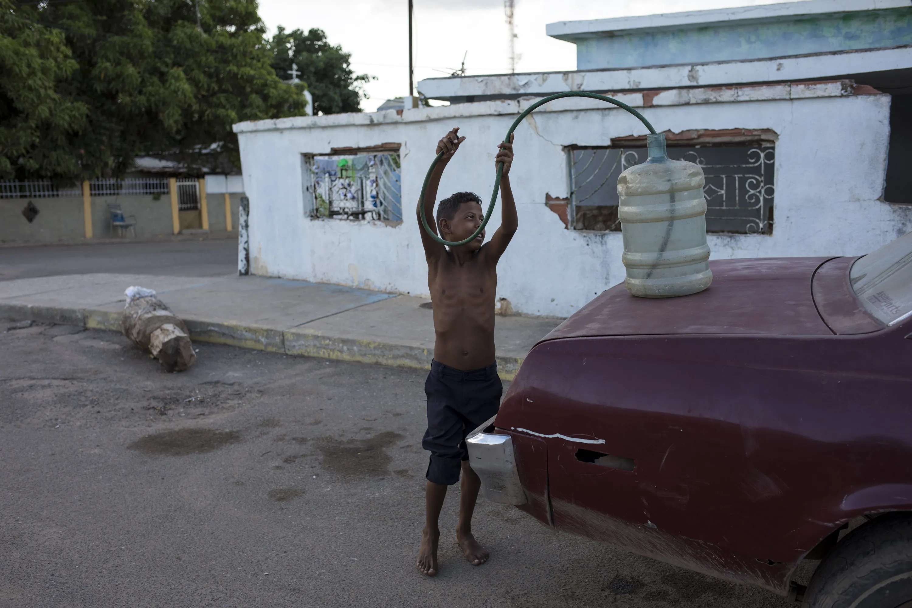 In this November 14, 2019 photo, a boy returns a hose into a jug after siphoning gas into the family car in the “Altos de Milagros Norte” neighborhood in Maracaibo, Venezuela. The downfall of Maracaibo and the lake by the same name has been especially brutal. It was once the hub of Venezuela’s thriving oil industry. Critics blame two decades of socialist rule for destroying the oil industry, that today produces a fraction of what it did at its height two decades ago. The Venezuelan government blames U.S. sanctions for many of its problems. (Photo by Rodrigo Abd/AP Photo)