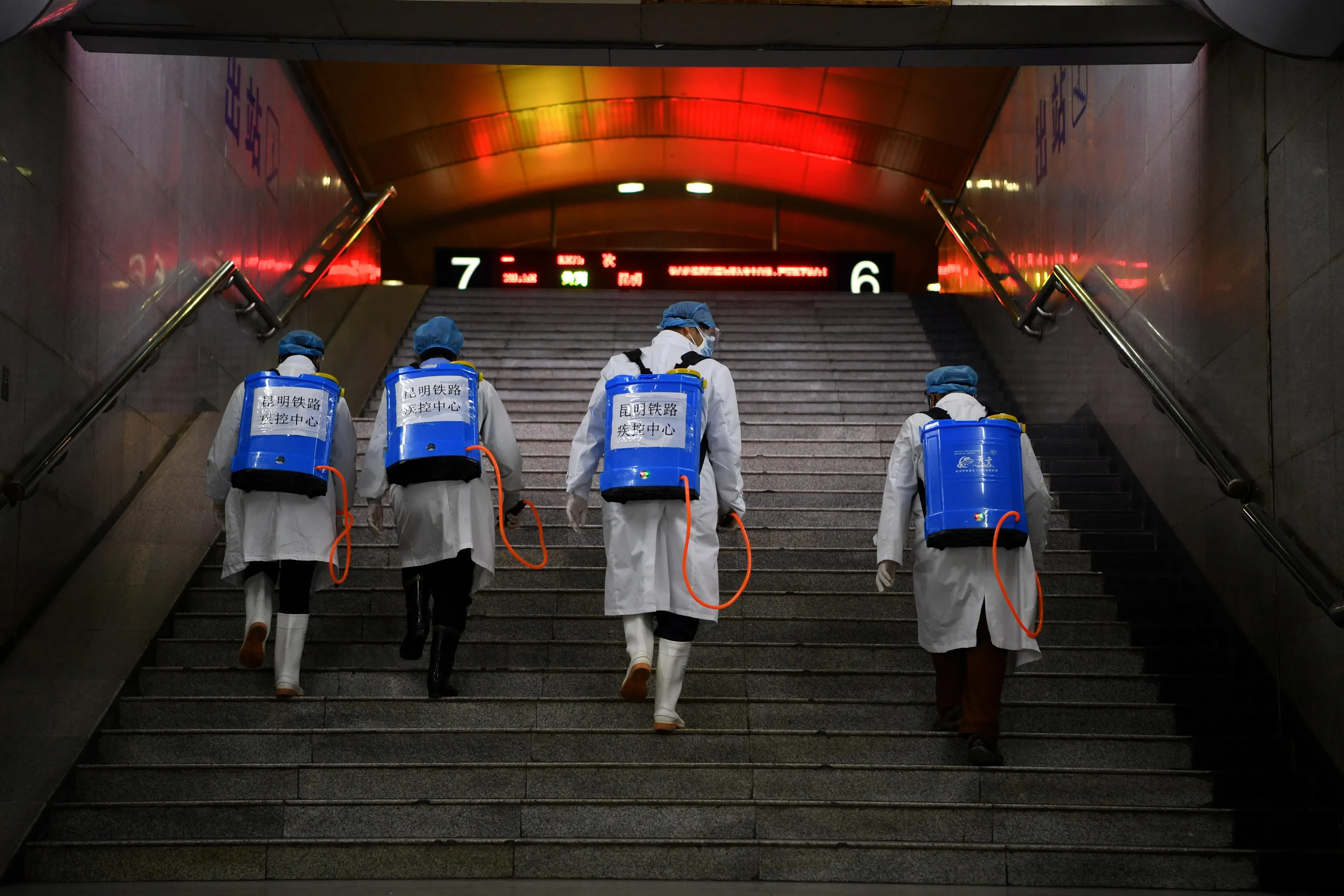 Workers with sanitizing equipment walk up a flight of stairs as they disinfect a railway station in Kunming, Yunnan province, China, February 4, 2020. (Photo by Cnsphoto via Reuters)