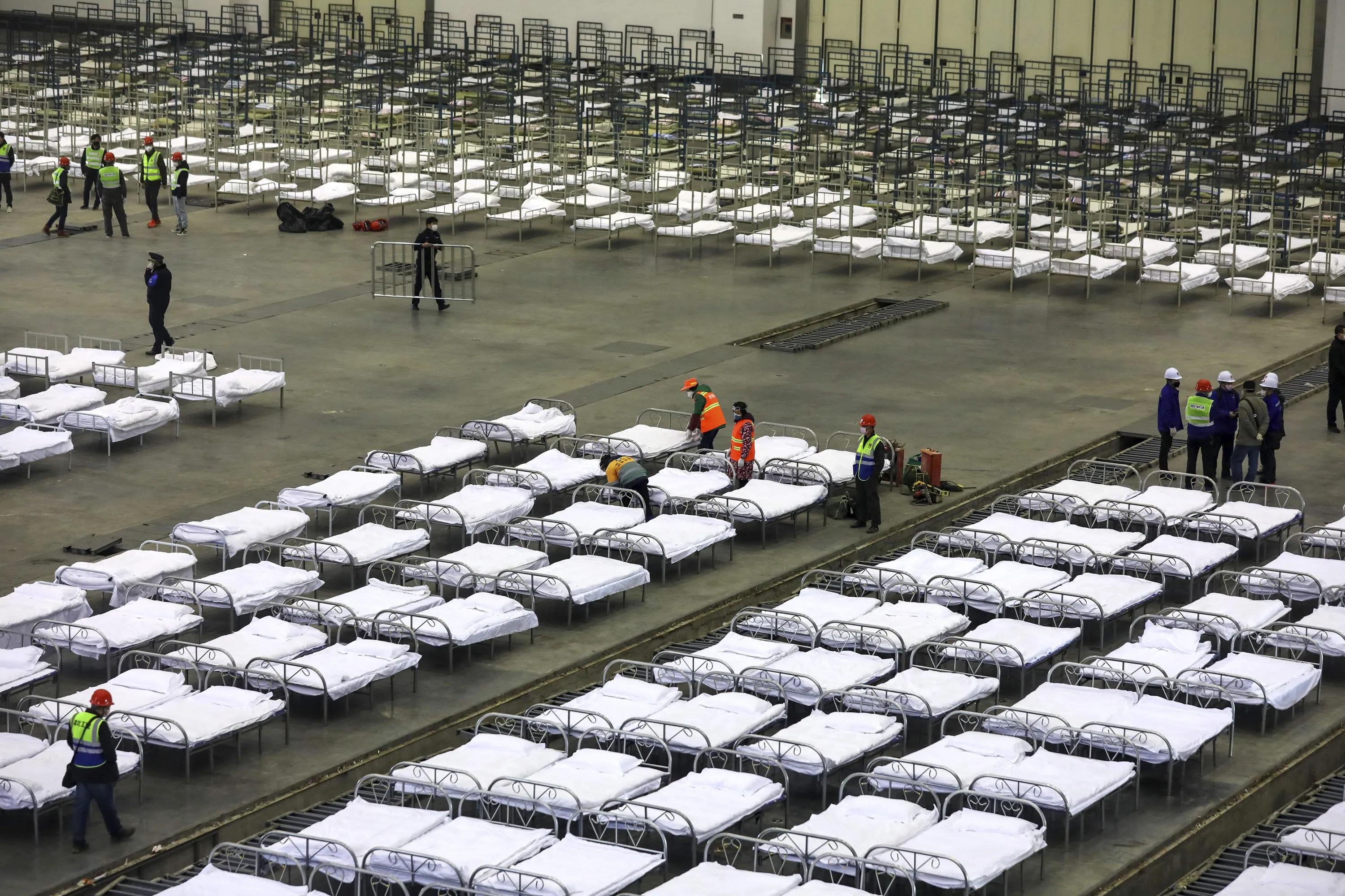 Workers arrange beds in a convention center that has been converted into a temporary hospital in Wuhan in central China's Hubei Province, Tuesday, February 4, 2020. (Photo by Chinatopix via AP Photo)