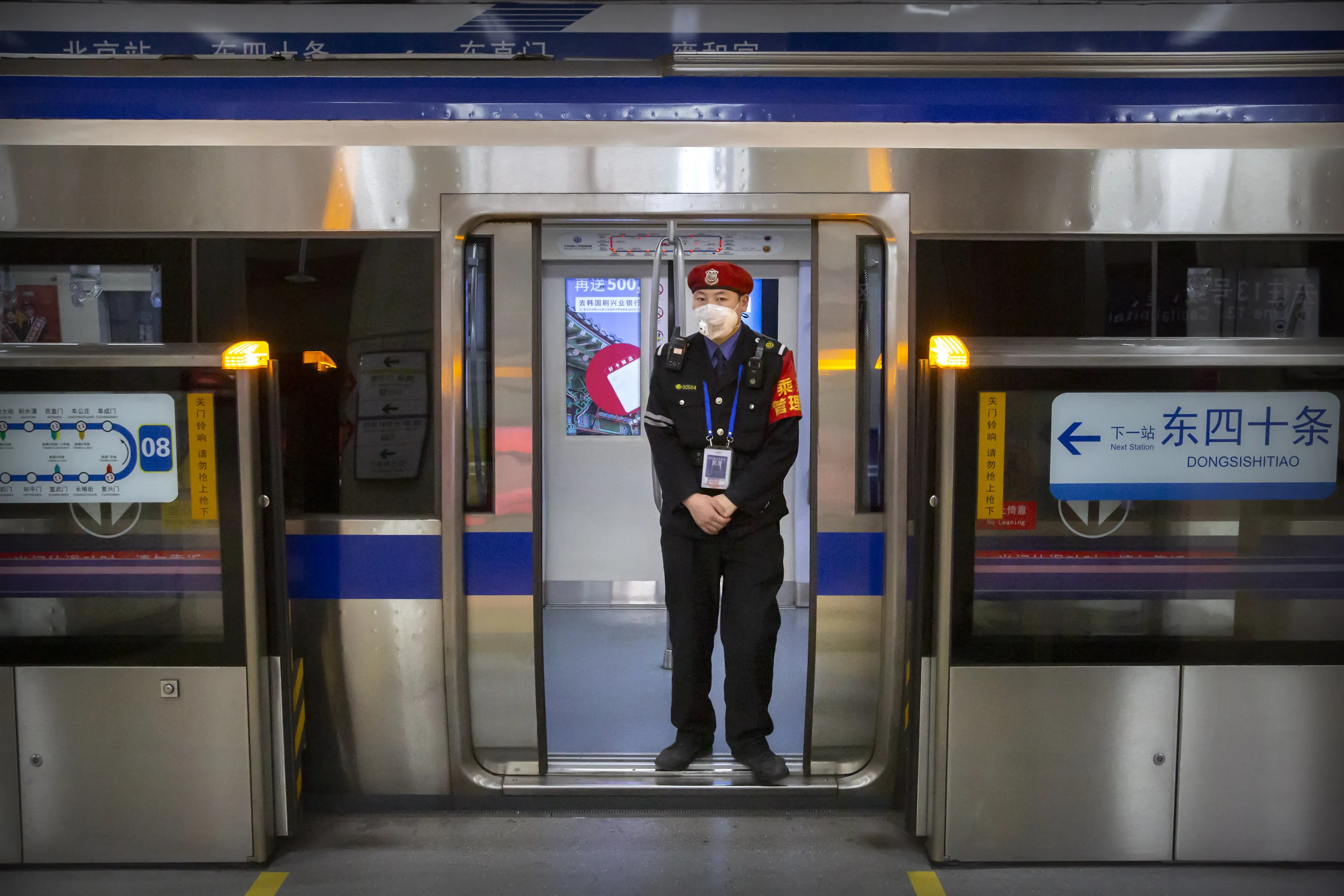 In this February 3, 2020, file photo, a security officer wearing a face mask stands on a subway train in Beijing. Health authorities are preparing for a possible pandemic as they work to contain a respiratory illness in China that's caused by a new virus. Governments are working to contain the virus by limiting travel, isolating sick people and keeping travelers returning from the affected region under quarantine to watch for symptoms. (Photo by Mark Schiefelbein/AP Photo/File)