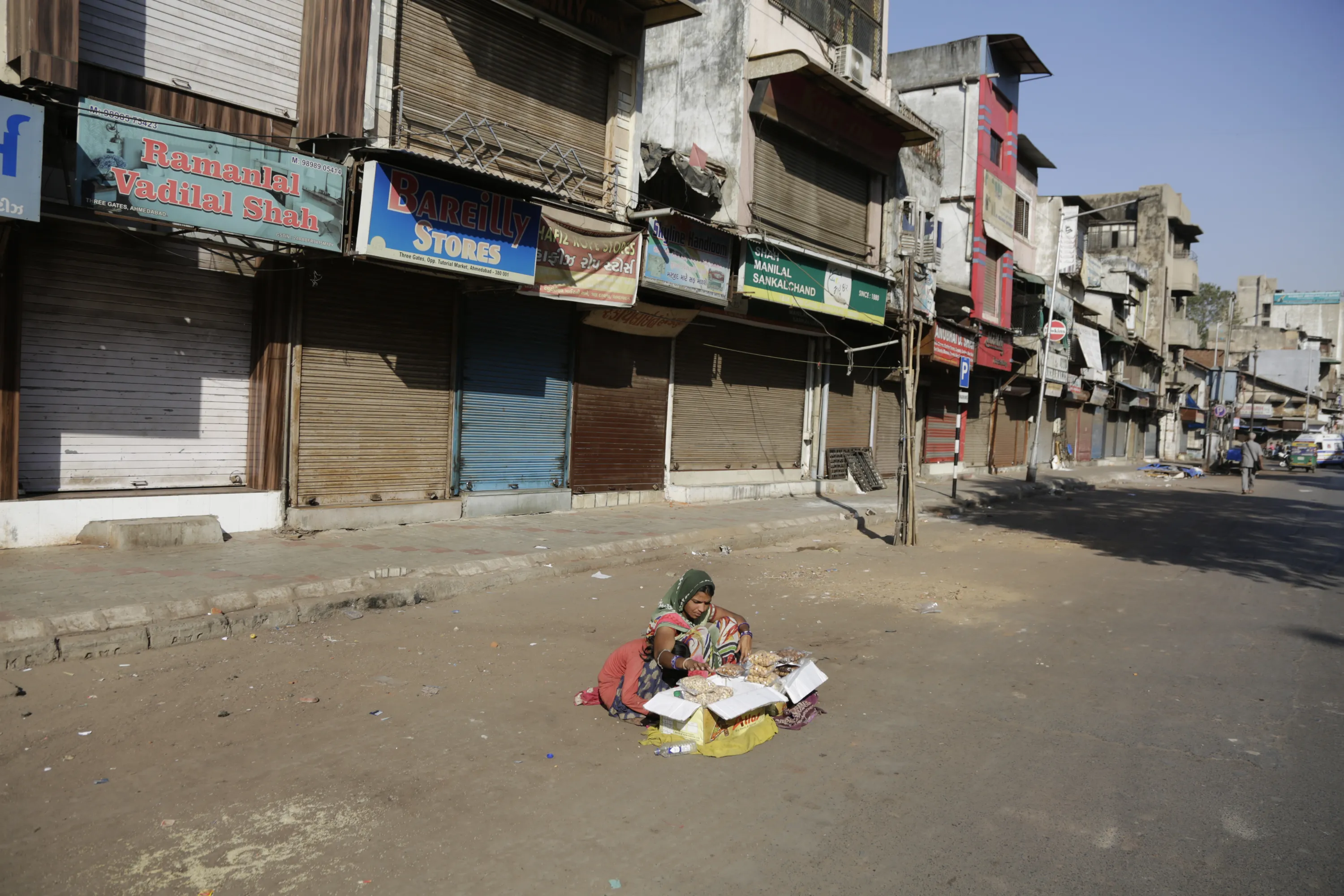 An Indian woman sells dry fruits in front of closed shops during a strike called by various organizations to protest against new citizenship law in Ahmadabad, India, Wednesday, January 29, 2020. The new citizenship law and a proposed National Register of Citizens have brought thousands of protesters out in the streets in many cities and towns since Parliament approved the measure on Dec. 11. (Photo by Ajit Solanki/AP Photo)