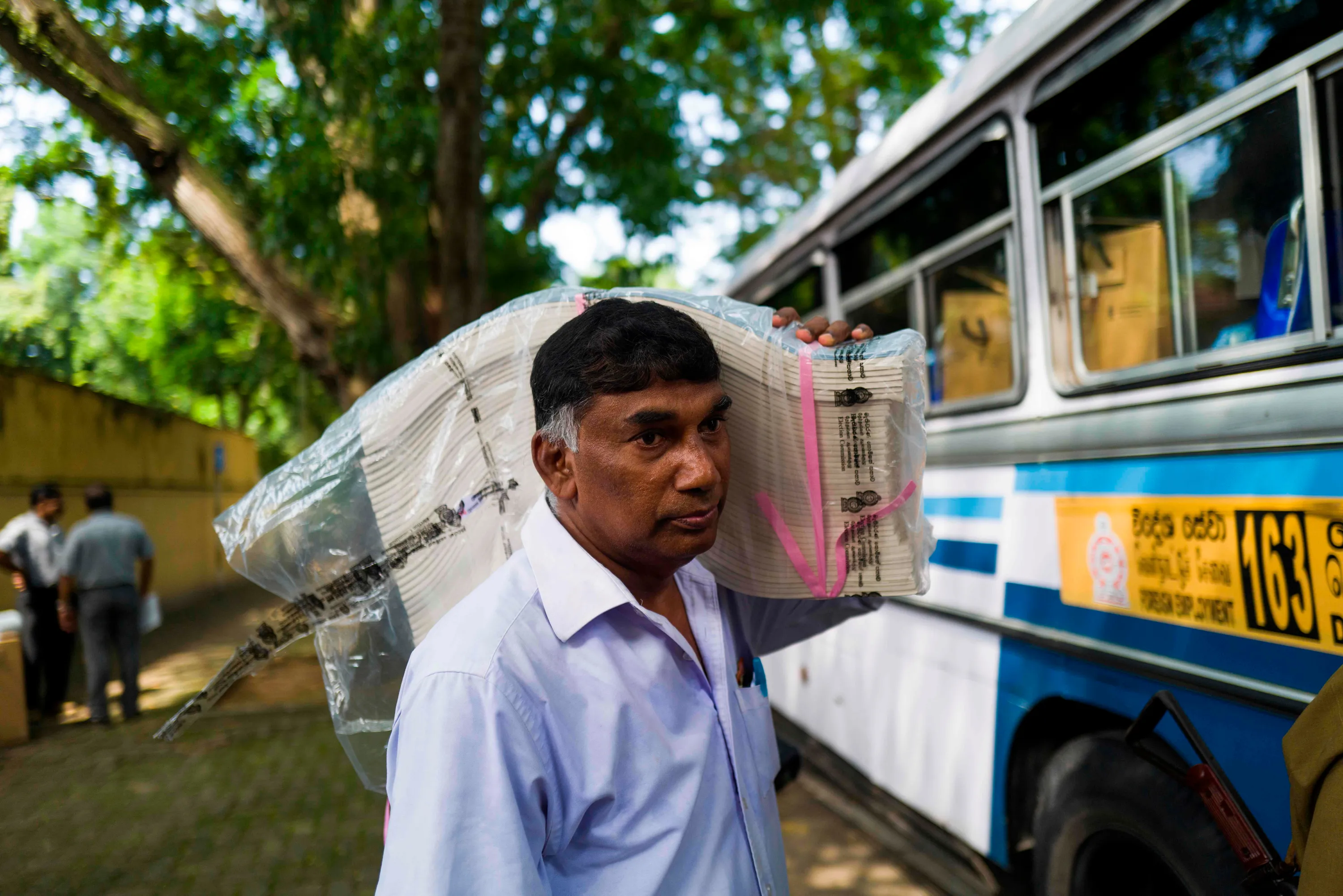 An electoral official carries ballot papers on his shoulder as he boards a bus to go to his respective polling station on the eve of the presidential election, in Colombo on November 15, 2019. (Photo by Jewel Samad/AFP Photo)