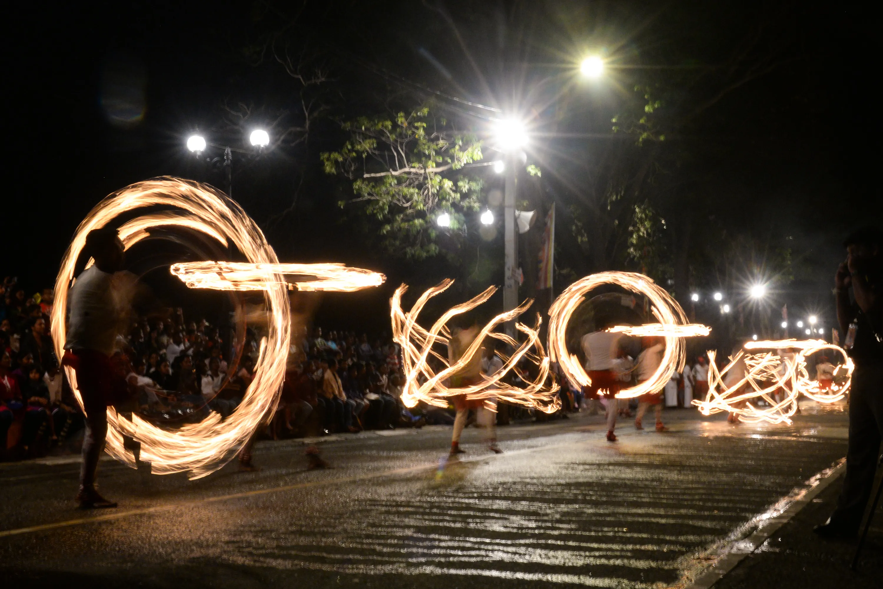 In this photograph taken on August 14, 2019 fire-dancers perform during the “Esala Perahera” festival near the Buddhist temple of the Tooth in the ancient hill capital of Kandy, some 116 kilometres from Colombo. The Temple of the Tooth, Buddhism's holiest shrine on the island, holds the annual festival with traditional drummers and dancers as well as nearly 100 tamed elephants. (Photo by Lakruwan Wanniarachchi/AFP Photo)