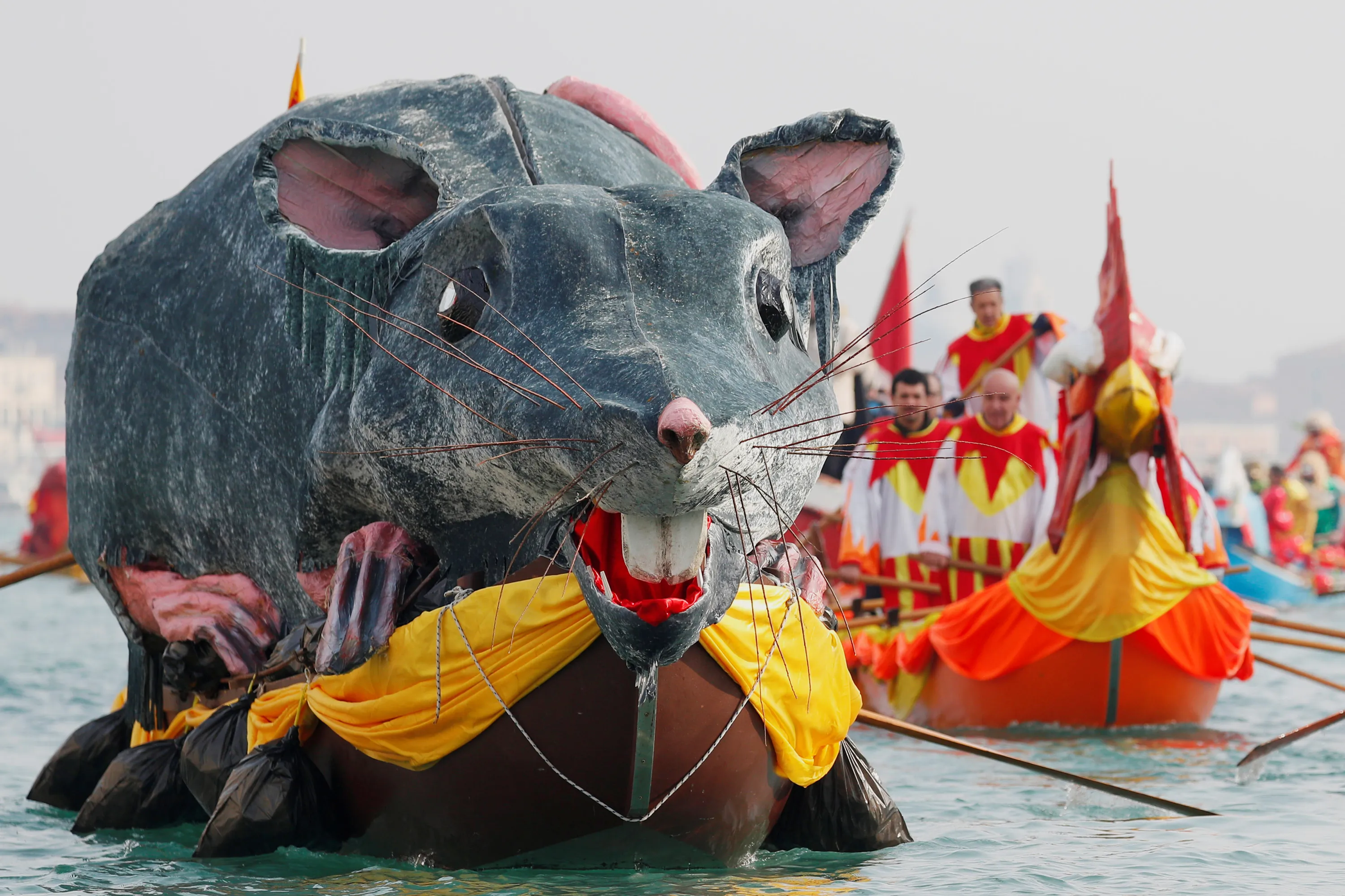 Venetians row during the masquerade parade on the Grand Canal during the Carnival in Venice, Italy, February 9, 2020. (Photo by Guglielmo Mangiapane/Reuters)