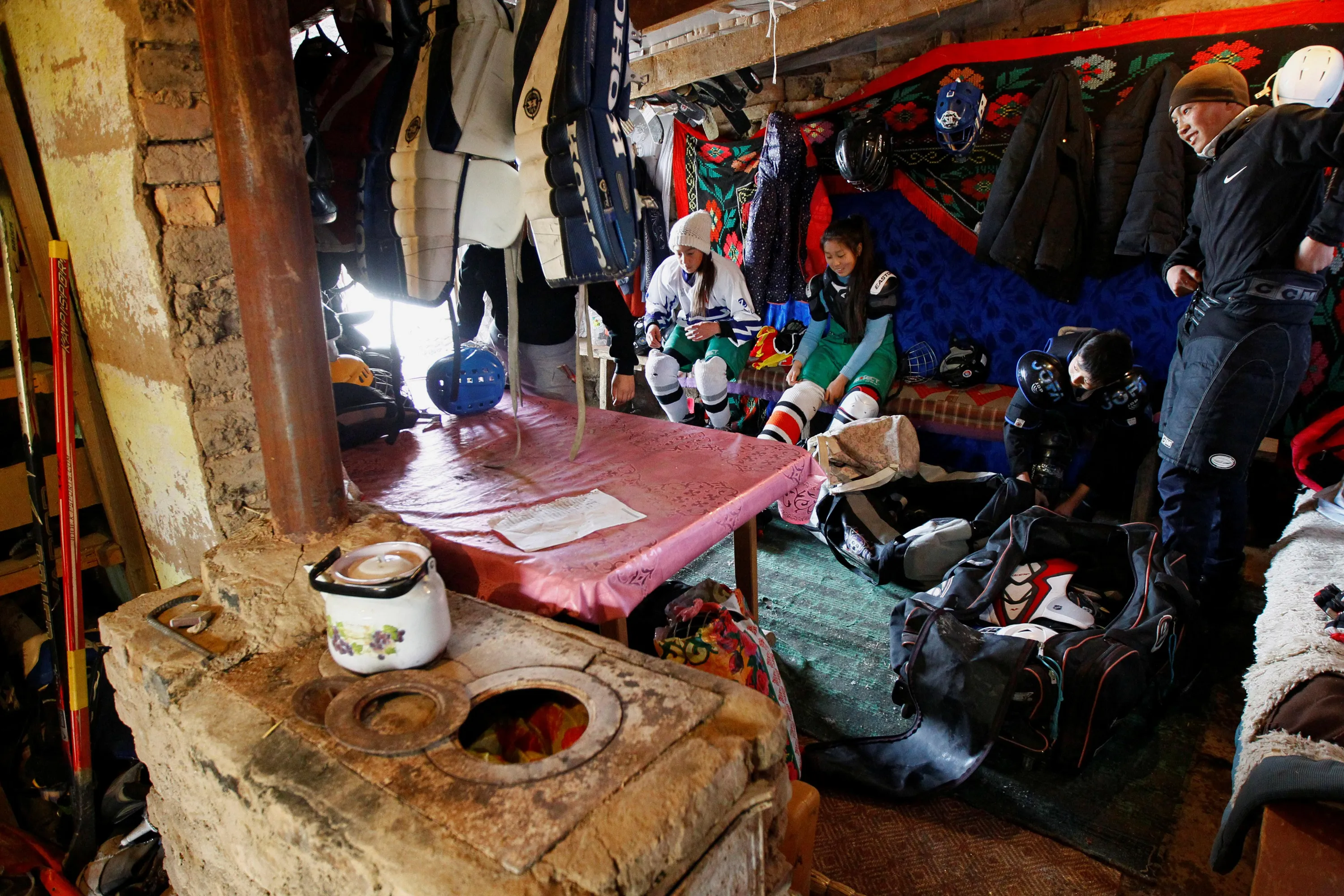 Young hockey players including members of Kyrgyzstan's first female hockey team prepare in a dressing room before a training session in the village of Otradnoye, Kyrgyzstan on February 4, 2020. Starting from nothing around three years ago, the team had to manage with whatever equipment they had and injuries were not uncommon. However, news of the team reached as far as Switzerland, resulting in hockey pad donations from the Kyrgyz community living there. (Photo by Vladimir Pirogov/Reuters)
