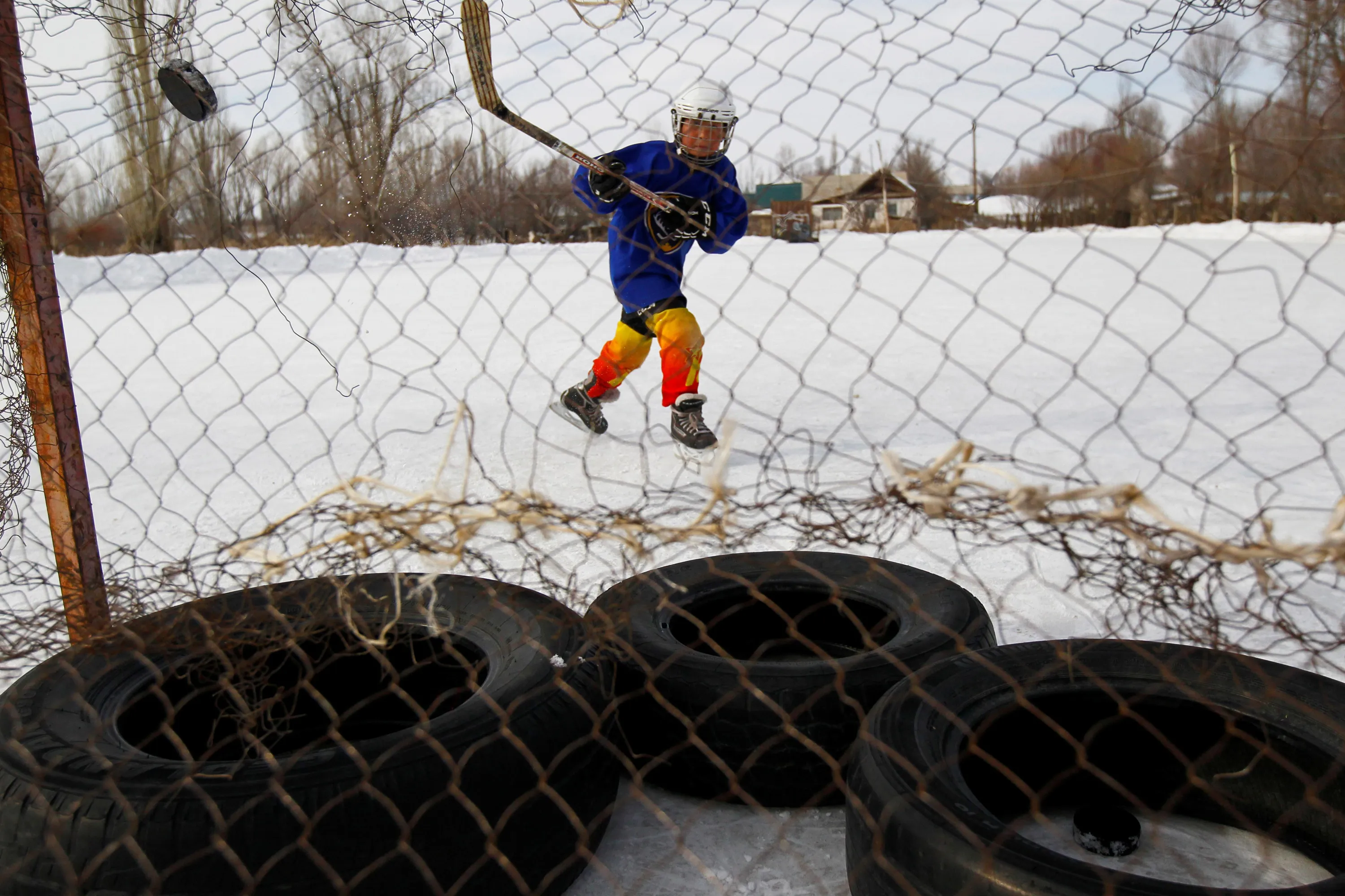 A young hockey player practices his putting during a training session in the village of Otradnoye, Kyrgyzstan on February 4, 2020. (Photo by Vladimir Pirogov/Reuters)