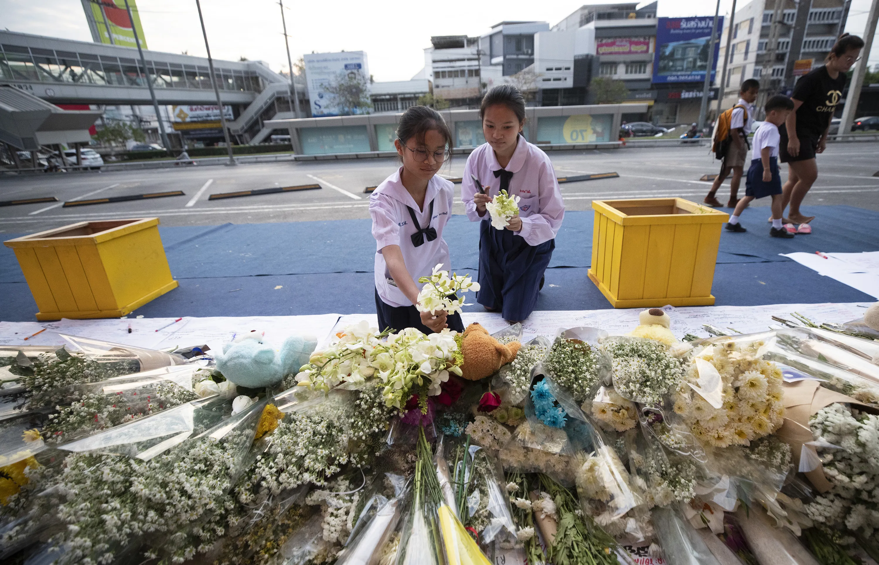 Students offer flowers at the scene of a deadly mass shooting outside the Terminal 21 shopping mall in Korat, Nakhon Ratchasima, Thailand Tuesday, February 11, 2020. A soldier carried out the country's worst mass shooting in an hourslong siege at the shopping mall. (Photo by Sakchai Lalit/AP Photo)