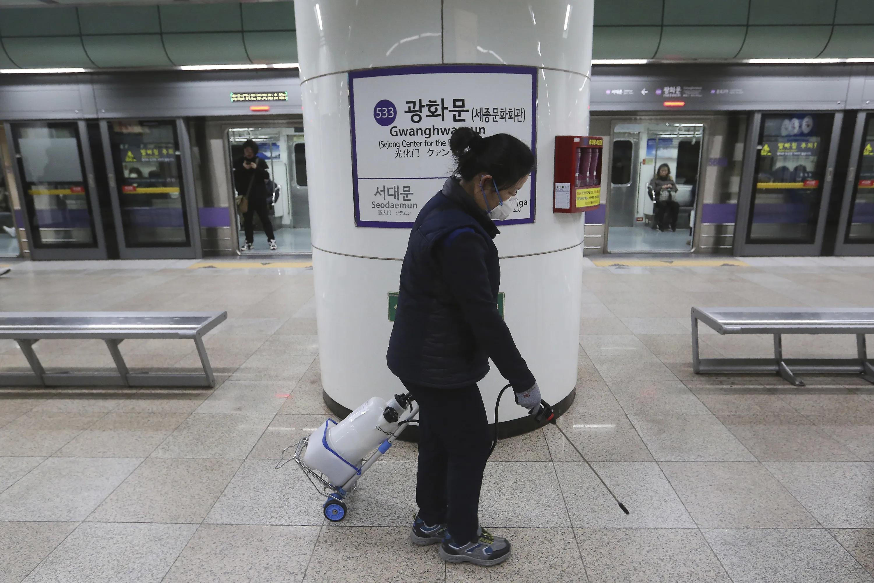 An employee disinfects the platform in hopes to prevent transmission of the coronavirus at a subway station in Seoul, South Korea, Tuesday, January 28, 2020. Deaths from a new viral disease that is causing mounting global concern rose by 25 to at least 106 in China on Tuesday as the United States and other governments prepared to fly their citizens out of the locked-down city at center of the outbreak. (Photo by Ahn Young-joon/AP Photo)