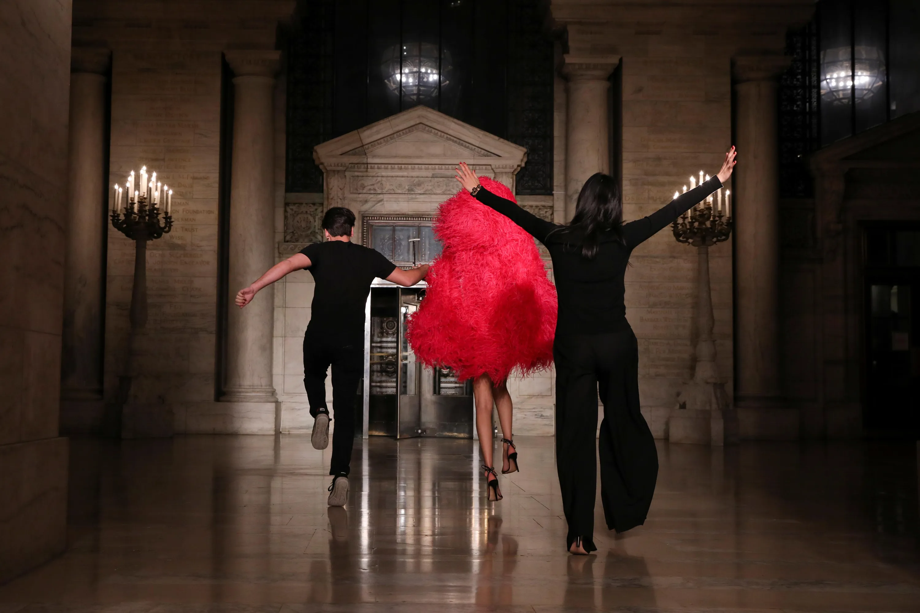 Designers Laura Kim and Fernando Garcia skip with model Bella Hadid after presenting the Oscar de la Renta Fall 2020 collection during New York Fashion Week in the Manhattan borough of New York, U.S., February 10, 2020. (Photo by Caitlin Ochs/Reuters)