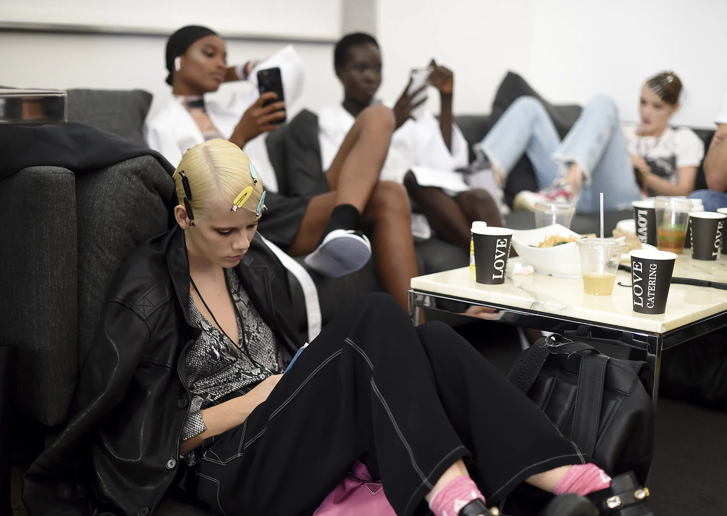Models prepare backstage at the Tom Ford show at Milk Studios during NYFW Fall/Winter 2020 on Friday, February 7, 2020, in Los Angeles. (Photo by Jordan Strauss/Invision/AP Photo)