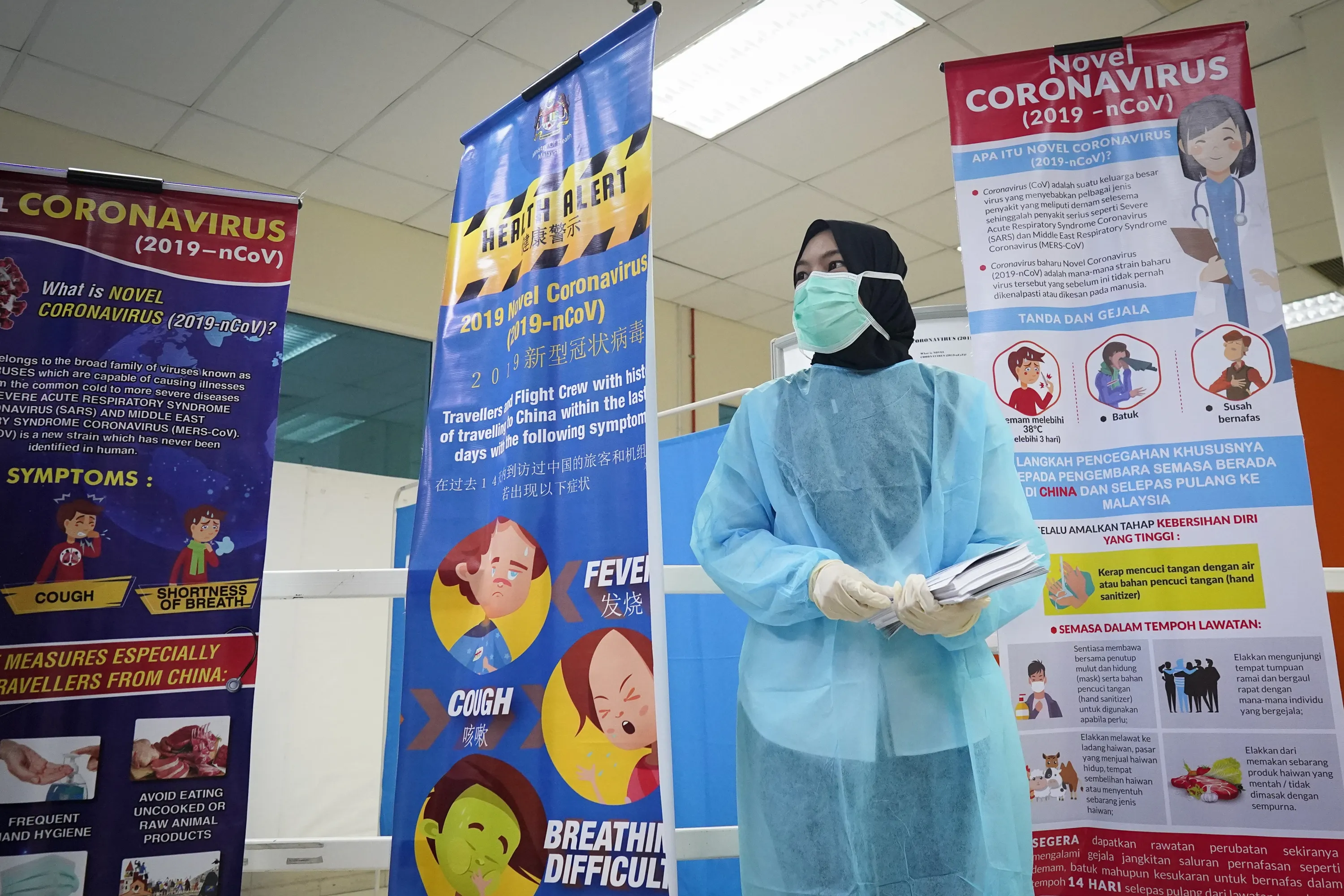 A health official wearing a protection suit and a face mask waits for passengers at a cruise ship terminal in Port Klang, Malaysia, Thursday, February 13, 2020. COVID-19 sickened tens of thousands of people in China since December, and more than 170 cases have been confirmed on another cruise ship, the Diamond Princess, which made stops in Hong Kong and other ports before arriving in Japan last week. (Photo by Vincent Thian/AP Photo)