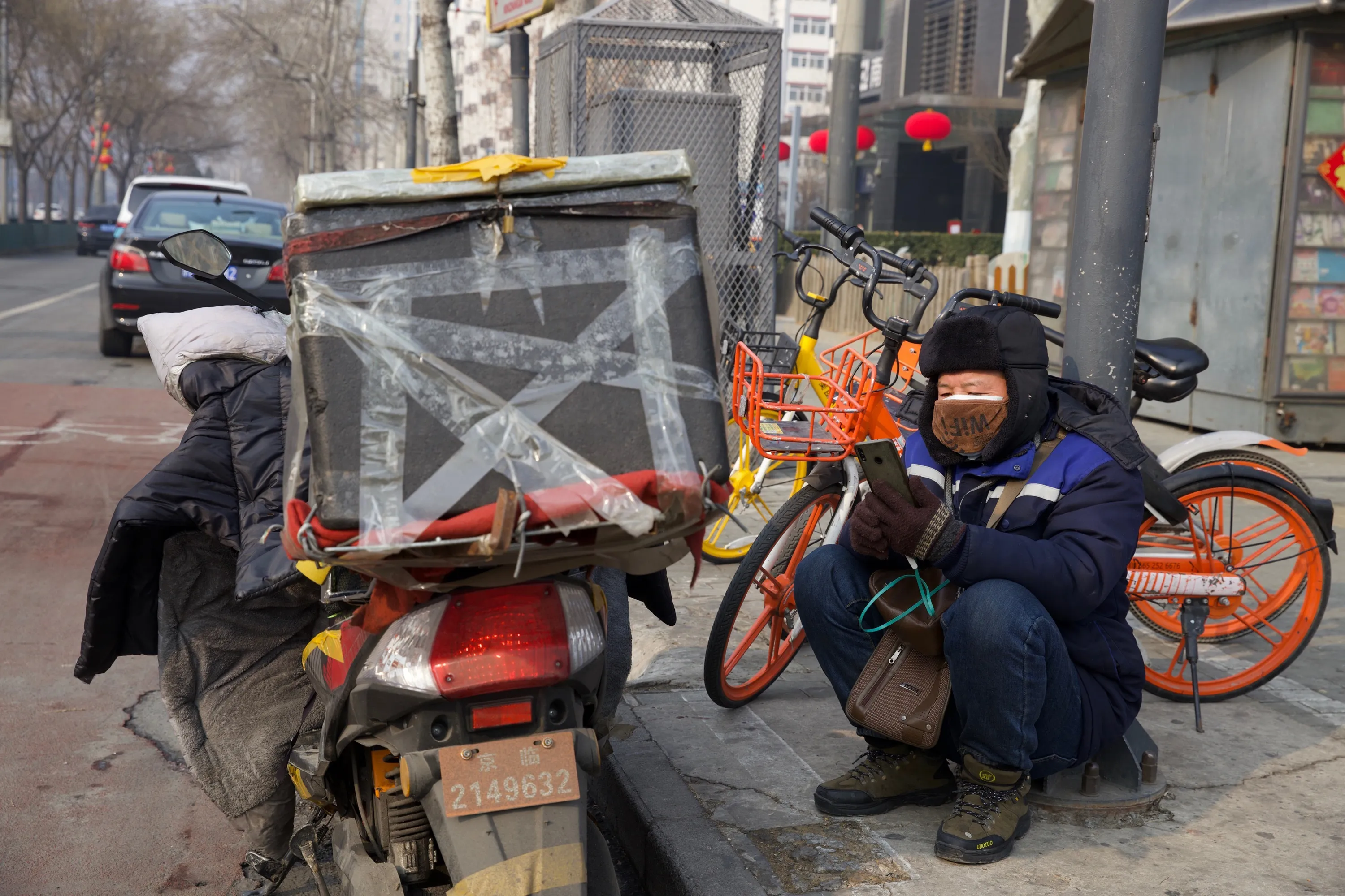 A deliver man uses his phone while waiting on a street of Beijing, China Tuesday, February 11, 2020. China's daily death toll from a new virus topped 100 for the first time and pushed the total past 1,000 dead, authorities said Tuesday after leader Xi Jinping visited a health center to rally public morale amid little sign the contagion is abating. (Photo by Ng Han Guan/AP Photo)
