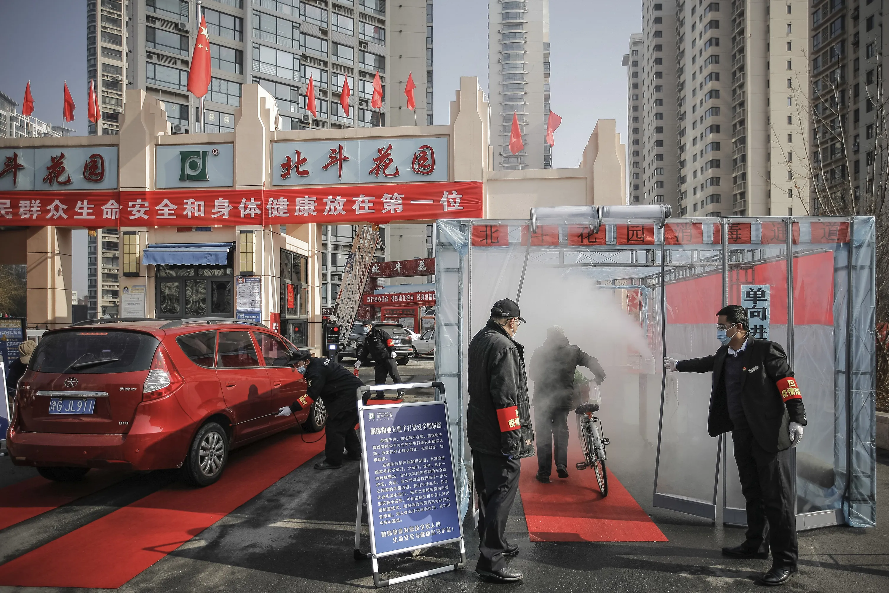 Security guards hold the curtain for a cyclist to past through a disinfectant spray in order to return home at a residential complex in northern China's Tianjin Municipality Tuesday, February 11, 2020. China's daily death toll from a new virus topped 100 for the first time and pushed the total past 1,000 dead, authorities said Tuesday after leader Xi Jinping visited a health center to rally public morale amid little sign the contagion is abating. (Photo by Chinatopix via AP Photo)