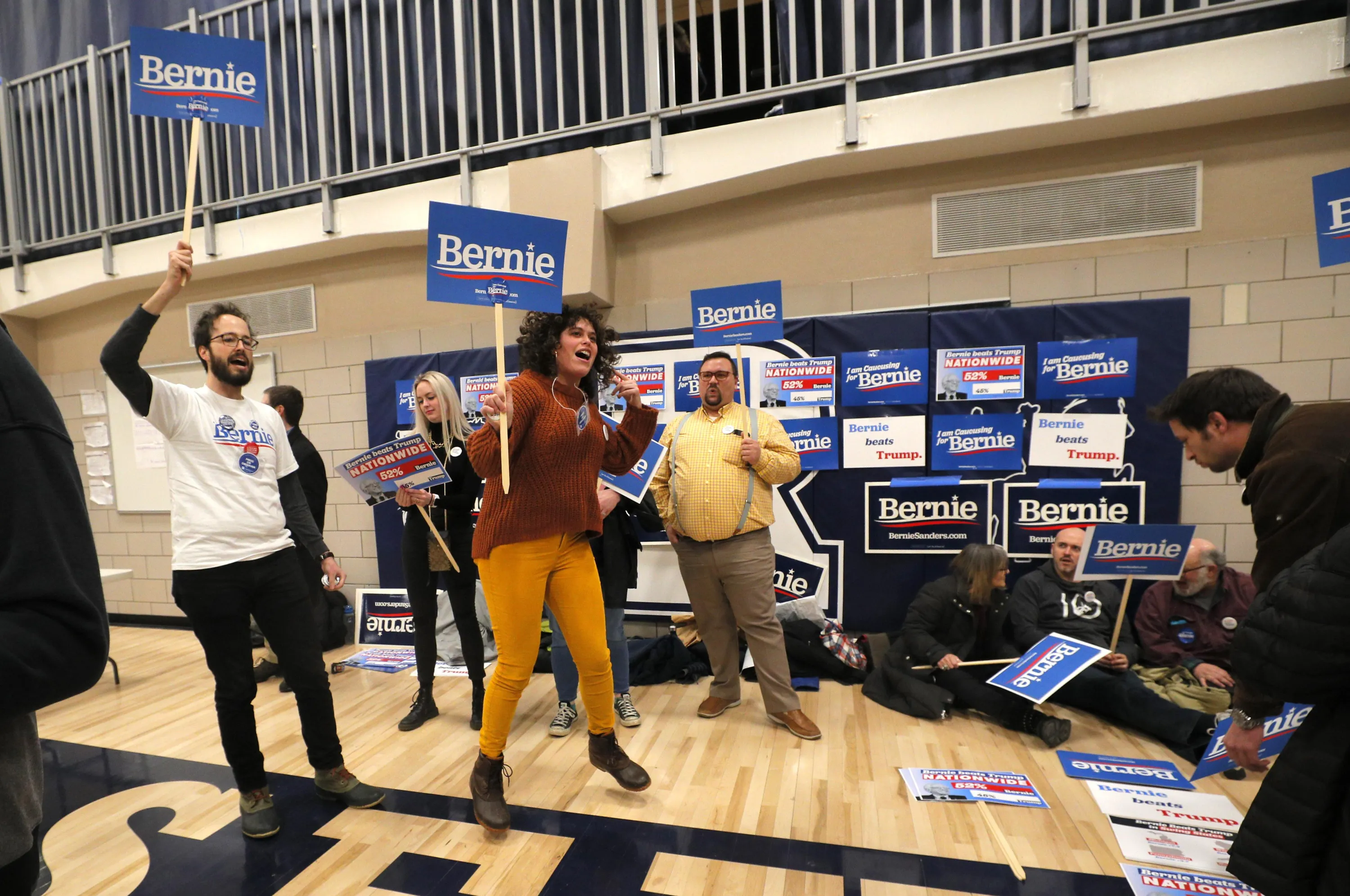 Supporters of Democratic presidential candidate Senator Bernie Sanders hold signs at a caucus in Des Moines, Iowa, U.S. February 3, 2020. (Photo by Brian Snyder/Reuters)