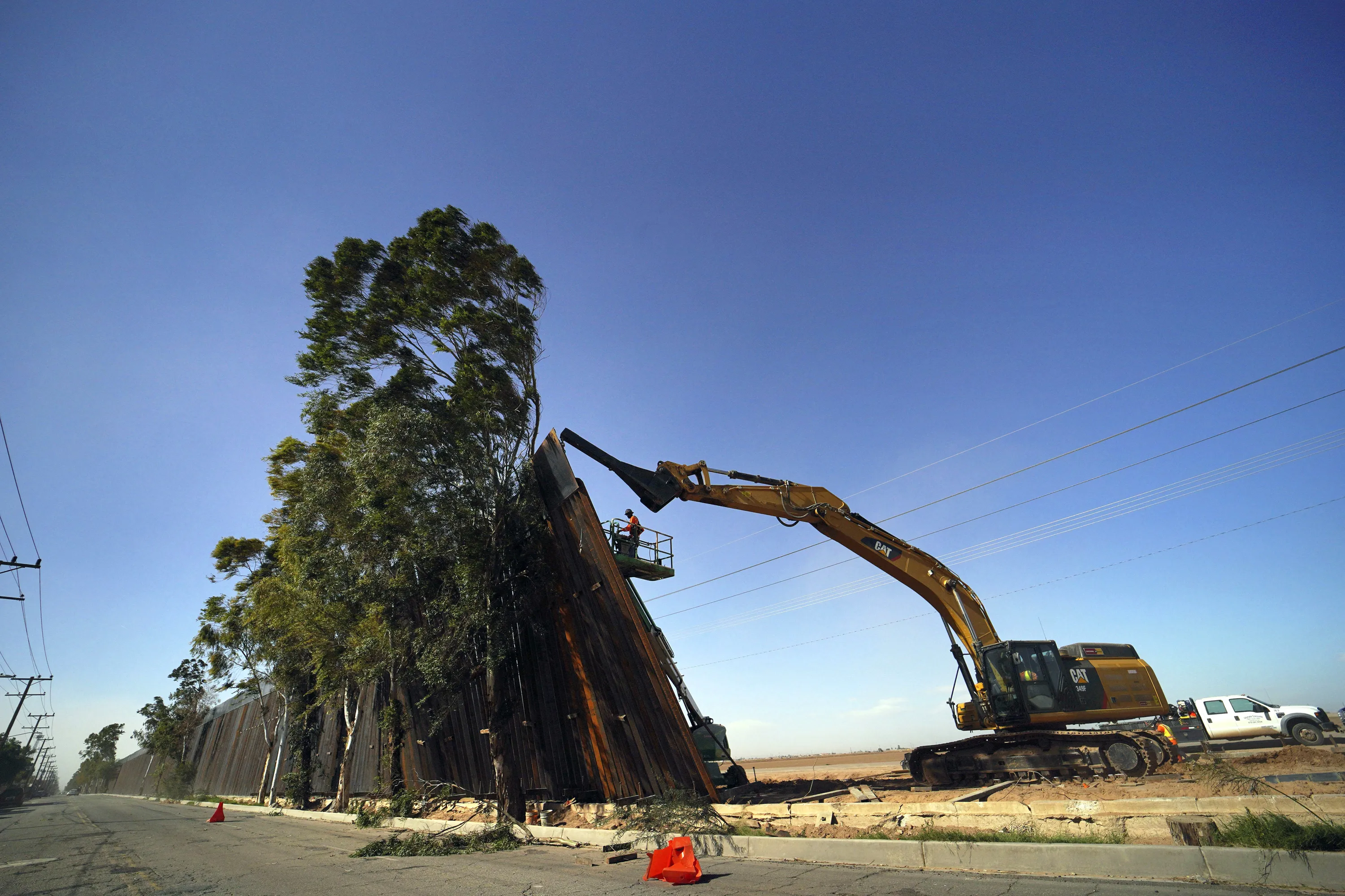 A construction crew works on a fallen section of the US-Mexico border wall as seen from Mexicali, Baja California state, Mexico, on January 29, 2020. Newly installed panels from the US border wall in Calexico, California, fell over in high winds Wednesday, landing on trees on the Mexican side of the border. (Photo by AFP Photo/Stringer)