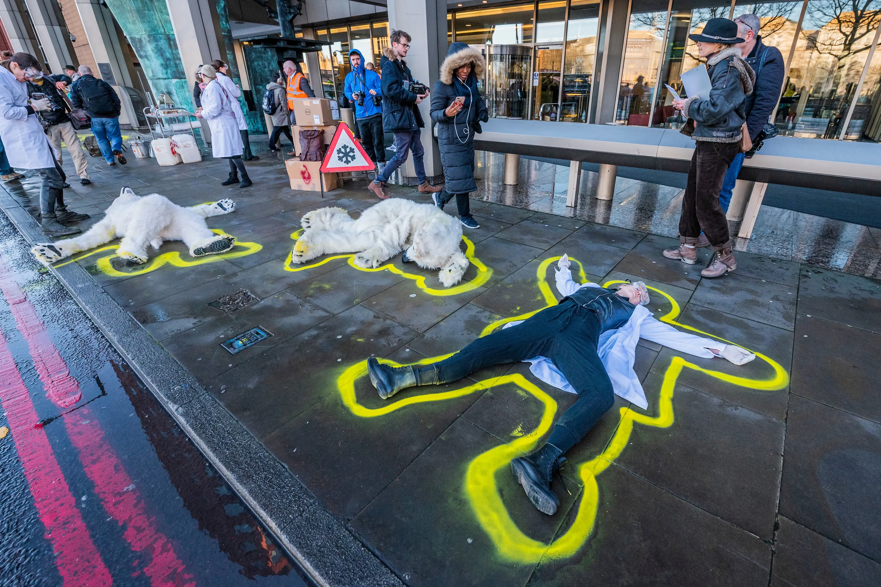 Extinction Rebellion protest against Arctic shipping pollution (“Dirty ship fuels are climate crimes”) as delegates arrive for an international shipping summit at Albert Embankment in London, England on February 17, 2020. (Photo by Guy Bell/Rex Features/Shutterstock)