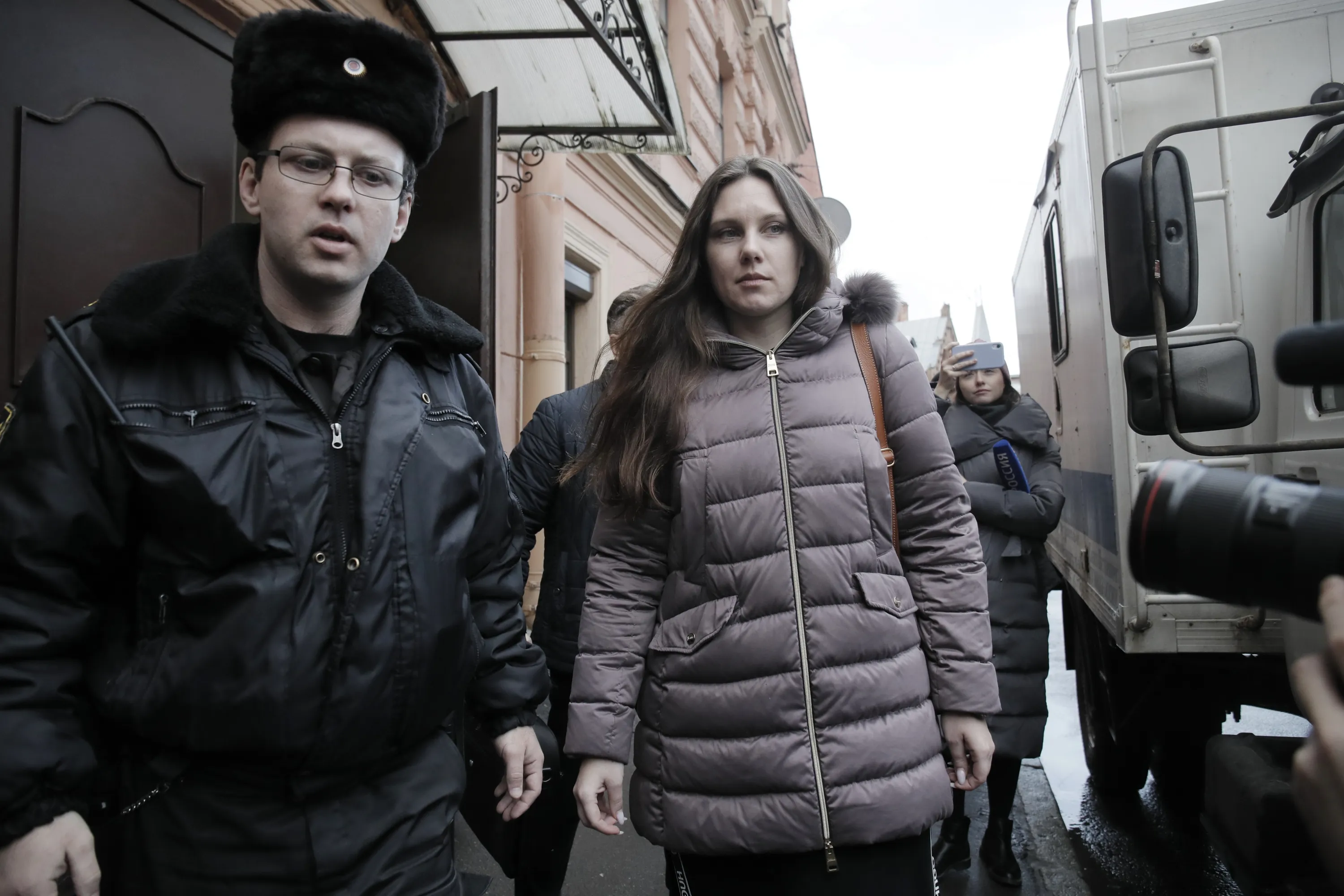 Alla Ilyina, who broke out of the hospital on Feb. 7 after learning that she would have to spend 14 days in isolation instead of the 24 hours doctors promised her, is escorted by a bailiffs form a court after a session in St.Petersburg, Russia, Monday, February 17, 2020.A woman who escaped from a hospital in St. Petersburg, where she was being kept in isolation for possible inflection by the new coronavirus, was ordered by court on Monday to return back to the quarantine for at least two days. (Photo by Dmitri Lovetsky/AP Photo)