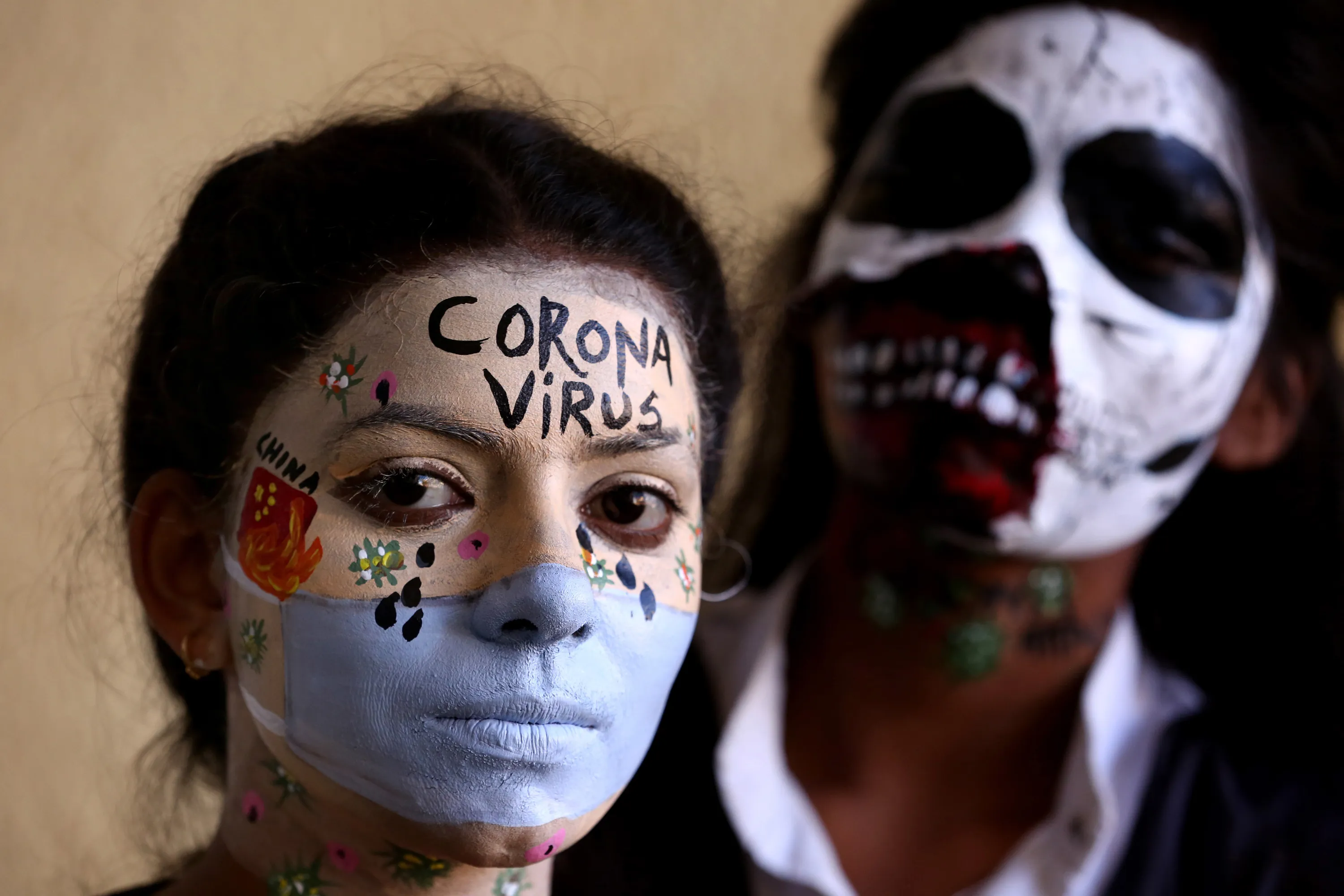 Indian students with face painted pose for a photo during an inter-college face painting competition at the Government Sardar Vallabh Bhai Patel Polytechnic College in Bhopal, India, 17 February 2020. Over fifty people participated in the event and made face paintings on various issues including the coronavirus or COVID-19. (Photo by Sanjeev Gupta/EPA/EFE)