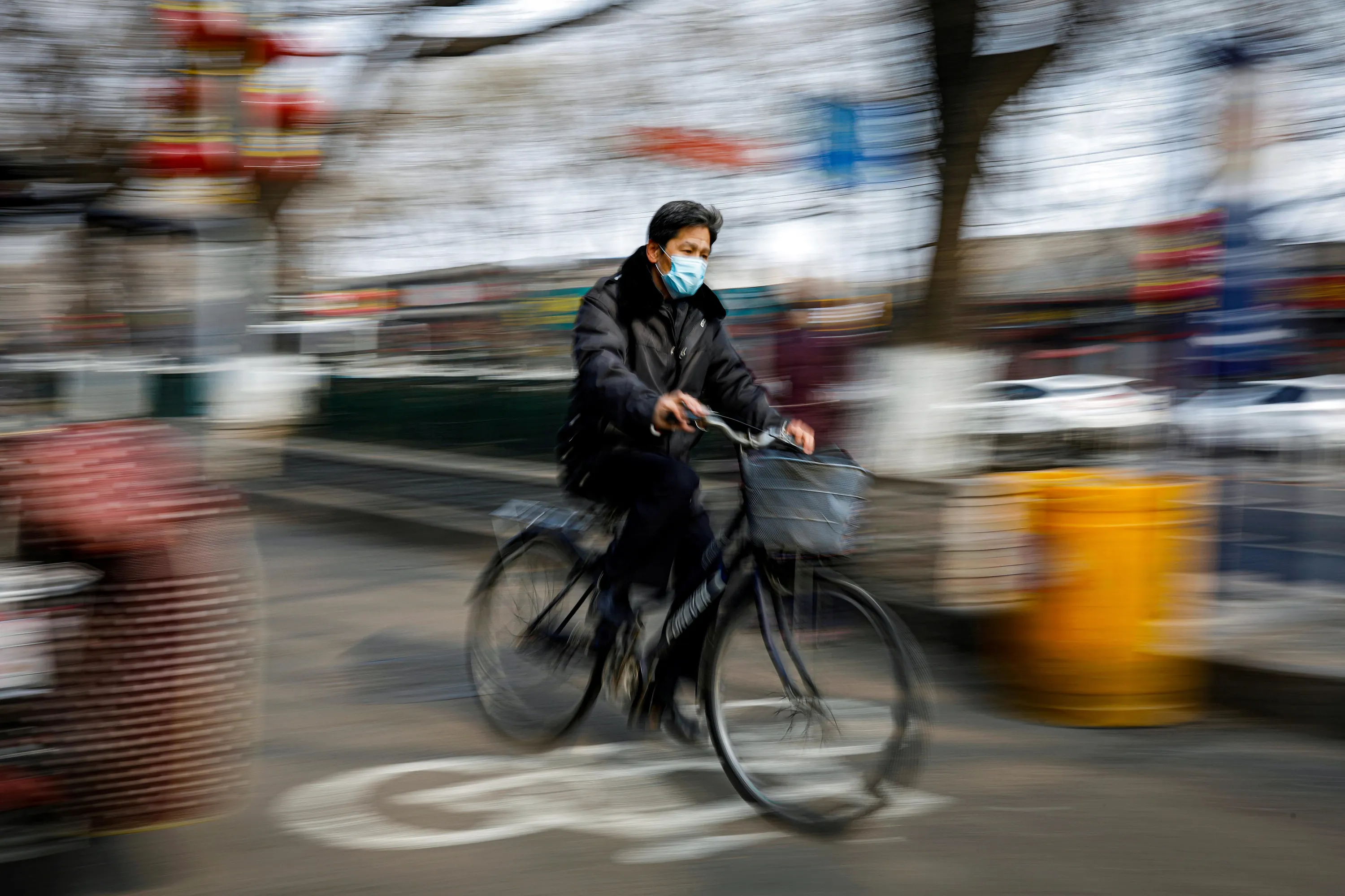 A man wearing a face mask rides a bicycle, as the country is hit by an outbreak of the novel coronavirus, in Beijing, China on February 12, 2020. (Photo by Carlos Garcia Rawlins/Reuters)